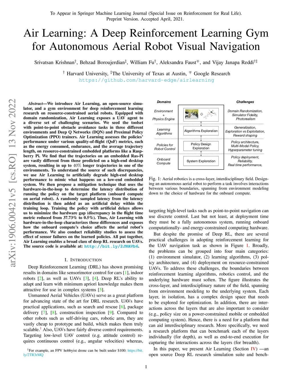 We introduce Air Learning, an open-source simulator, and a gym environment for deep reinforcement learning research on resource-constrained aerial robots. Equipped with domain randomization, Air Learning exposes a UAV agent to a diverse set of challenging scenarios. We seed the toolset with point-to-point obstacle avoidance tasks in three different environments and Deep Q Networks (DQN) and Proximal Policy Optimization (PPO) trainers. Air Learning assesses the policies' performance under various quality-of-flight (QoF) metrics, such as the energy consumed, endurance, and the average trajectory length, on resource-constrained embedded platforms like a Raspberry Pi. We find that the trajectories on an embedded Ras-Pi are vastly different from those predicted on a high-end desktop system, resulting in up to 40% longer trajectories in one of the environments. To understand the source of such discrepancies, we use Air Learning to artificially degrade high-end desktop performance to mimic what happens on a low-end embedded system. We then propose a mitigation technique that uses the hardware-in-the-loop to determine the latency distribution of running the policy on the target platform (onboard compute on the aerial robot). A randomly sampled latency from the latency distribution is then added as an artificial delay within the training loop. Training the policy with artificial delays allows us to minimize the hardware gap (discrepancy in the flight time metric reduced from 37.73% to 0.5%). Thus, Air Learning with hardware-in-the-loop characterizes those differences and exposes how the onboard compute's choice affects the aerial robot's performance. We also conduct reliability studies to assess the effect of sensor failures on the learned policies. All put together, Air Learning enables a broad class of deep RL research on UAVs. The source code is available at:http://bit.ly/2JNAVb6.