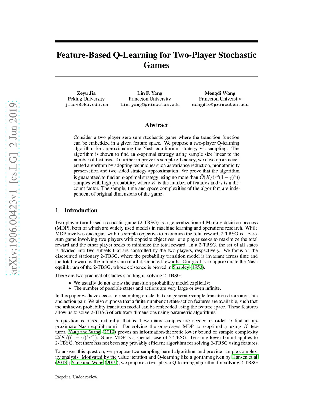 Consider a two-player zero-sum stochastic game where the transition function can be embedded in a given feature space. We propose a two-player Q-learning algorithm for approximating the Nash equilibrium strategy via sampling. The algorithm is shown to find an -optimal strategy using sample size linear to the number of features. To further improve its sample efficiency, we develop an accelerated algorithm by adopting techniques such as variance reduction, monotonicity preservation and two-sided strategy approximation. We prove that the algorithm is guaranteed to find an -optimal strategy using no more than samples with high probability, where is the number of features and is a discount factor. The sample, time and space complexities of the algorithm are independent of original dimensions of the game.
