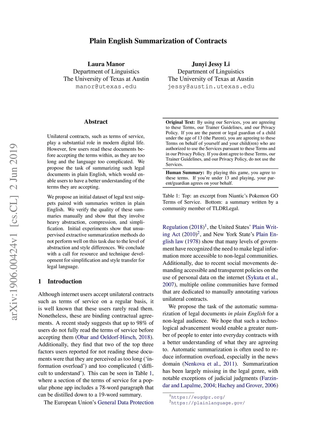 Unilateral contracts, such as terms of service, play a substantial role in modern digital life. However, few users read these documents before accepting the terms within, as they are too long and the language too complicated. We propose the task of summarizing such legal documents in plain English, which would enable users to have a better understanding of the terms they are accepting. We propose an initial dataset of legal text snippets paired with summaries written in plain English. We verify the quality of these summaries manually and show that they involve heavy abstraction, compression, and simplification. Initial experiments show that unsupervised extractive summarization methods do not perform well on this task due to the level of abstraction and style differences. We conclude with a call for resource and technique development for simplification and style transfer for legal language.