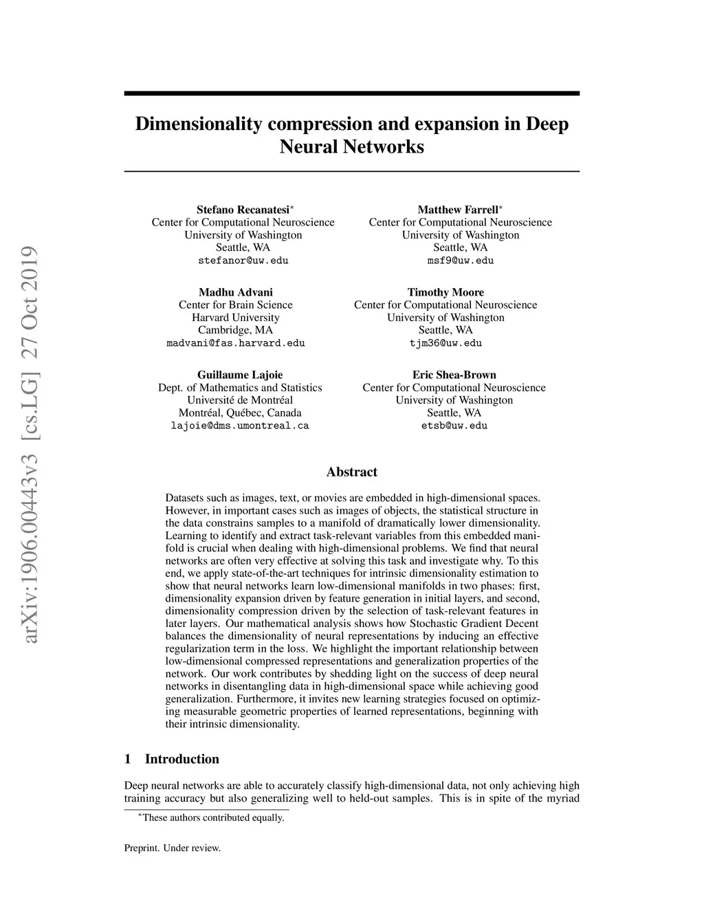 Datasets such as images, text, or movies are embedded in high-dimensional spaces. However, in important cases such as images of objects, the statistical structure in the data constrains samples to a manifold of dramatically lower dimensionality. Learning to identify and extract task-relevant variables from this embedded manifold is crucial when dealing with high-dimensional problems. We find that neural networks are often very effective at solving this task and investigate why. To this end, we apply state-of-the-art techniques for intrinsic dimensionality estimation to show that neural networks learn low-dimensional manifolds in two phases: first, dimensionality expansion driven by feature generation in initial layers, and second, dimensionality compression driven by the selection of task-relevant features in later layers. We model noise generated by Stochastic Gradient Descent and show how this noise balances the dimensionality of neural representations by inducing an effective regularization term in the loss. We highlight the important relationship between low-dimensional compressed representations and generalization properties of the network. Our work contributes by shedding light on the success of deep neural networks in disentangling data in high-dimensional space while achieving good generalization. Furthermore, it invites new learning strategies focused on optimizing measurable geometric properties of learned representations, beginning with their intrinsic dimensionality.