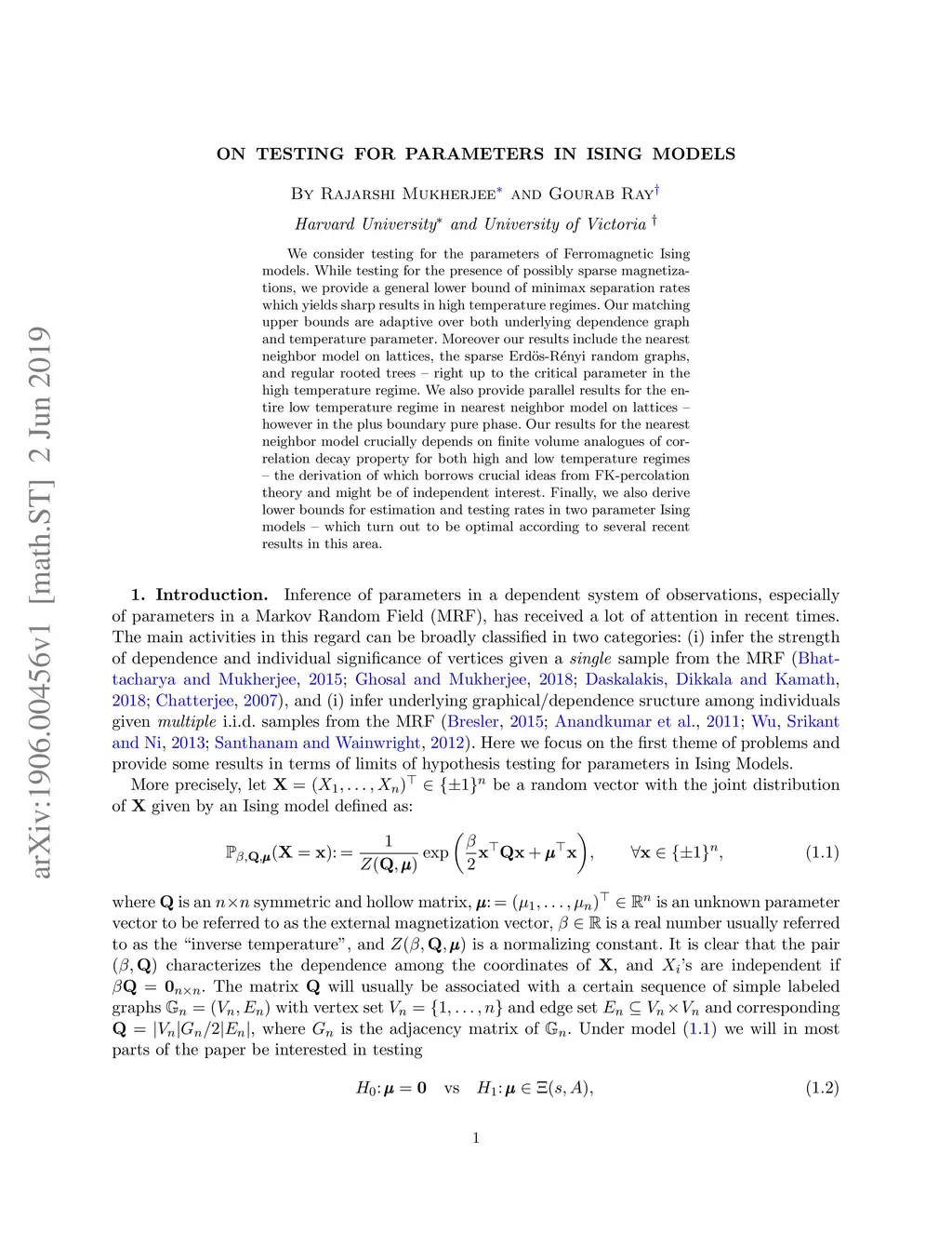 We consider testing for the parameters of Ferromagnetic Ising models. While testing for the presence of possibly sparse magnetizations, we provide a general lower bound of minimax separation rates which yields sharp results in high temperature regimes. Our matching upper bounds are adaptive over both underlying dependence graph and temperature parameter. Moreover our results include the nearest neighbor model on lattices, the sparse Erd\"{o}s-R\'{e}nyi random graphs, and regular rooted trees -- right up to the critical parameter in the high temperature regime. We also provide parallel results for the entire low temperature regime in nearest neighbor model on lattices -- however in the plus boundary pure phase. Our results for the nearest neighbor model crucially depends on finite volume analogues of correlation decay property for both high and low temperature regimes -- the derivation of which borrows crucial ideas from FK-percolation theory and might be of independent interest. Finally, we also derive lower bounds for estimation and testing rates in two parameter Ising models -- which turn out to be optimal according to several recent results in this area.