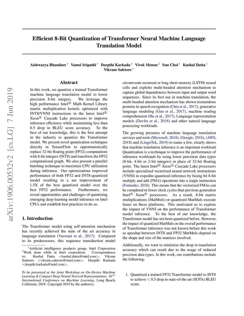 In this work, we quantize a trained Transformer machine language translation model leveraging INT8/VNNI instructions in the latest Intel Xeon Cascade Lake processors to improve inference performance while maintaining less than 0.5 drop in accuracy. To the best of our knowledge, this is the first attempt in the industry to quantize the Transformer model. This has high impact as it clearly demonstrates the various complexities of quantizing the language translation model. We present novel quantization techniques directly in TensorFlow to opportunistically replace 32-bit floating point (FP32) computations with 8-bit integers (INT8) and transform the FP32 computational graph. We also present a bin-packing parallel batching technique to maximize CPU utilization. Overall, our optimizations with INT8/VNNI deliver 1.5X improvement over the best FP32 performance. Furthermore, it reveals the opportunities and challenges to boost performance of quantized deep learning inference and establishes best practices to run inference with high efficiency on Intel CPUs.