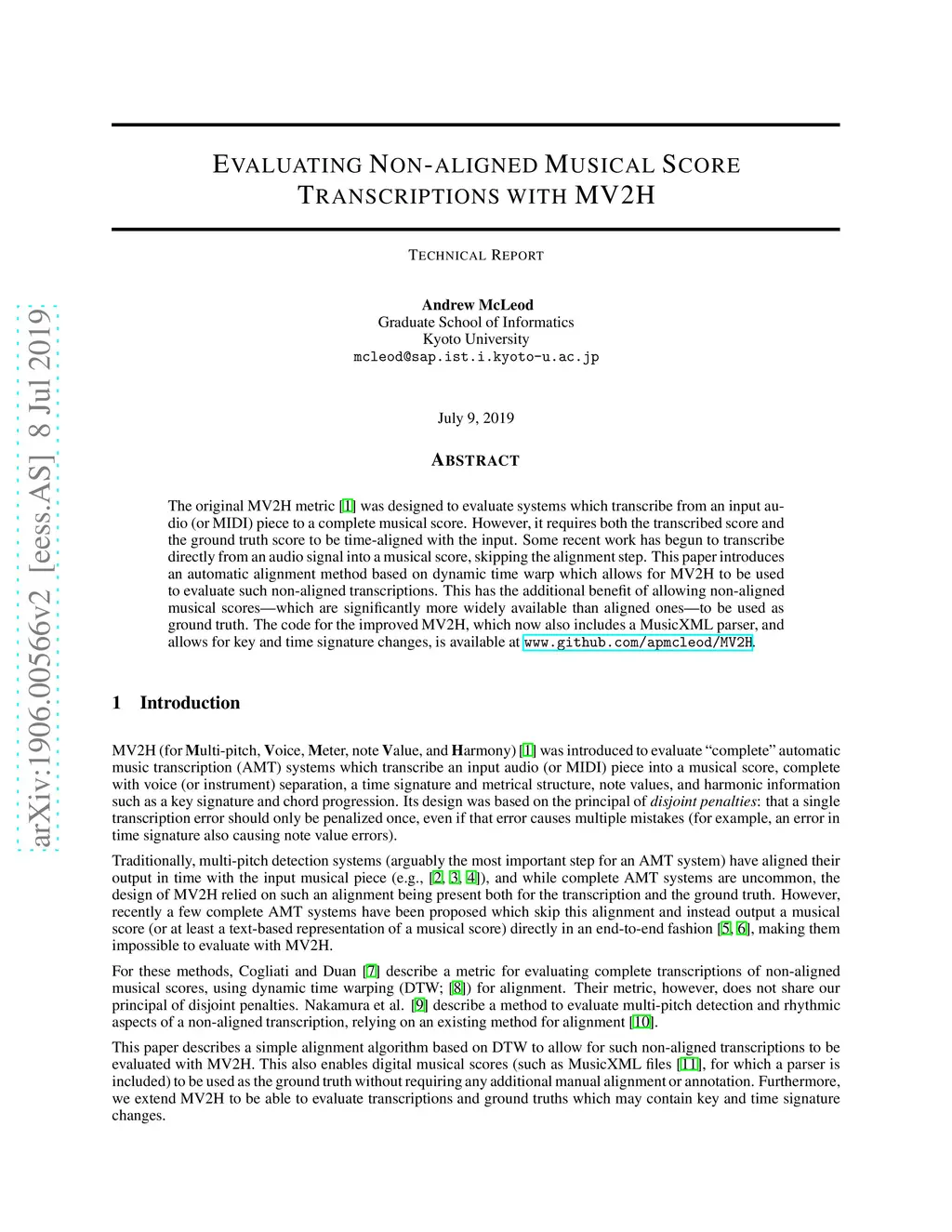The original MV2H metric was designed to evaluate systems which transcribe from an input audio (or MIDI) piece to a complete musical score. However, it requires both the transcribed score and the ground truth score to be time-aligned with the input. Some recent work has begun to transcribe directly from an audio signal into a musical score, skipping the alignment step. This paper introduces an automatic alignment method based on dynamic time warp which allows for MV2H to be used to evaluate such non-aligned transcriptions. This has the additional benefit of allowing non-aligned musical scores---which are significantly more widely available than aligned ones---to be used as ground truth. The code for the improved MV2H, which now also includes a MusicXML parser, and allows for key and time signature changes, is available at www.github.com/apmcleod/MV2H.
