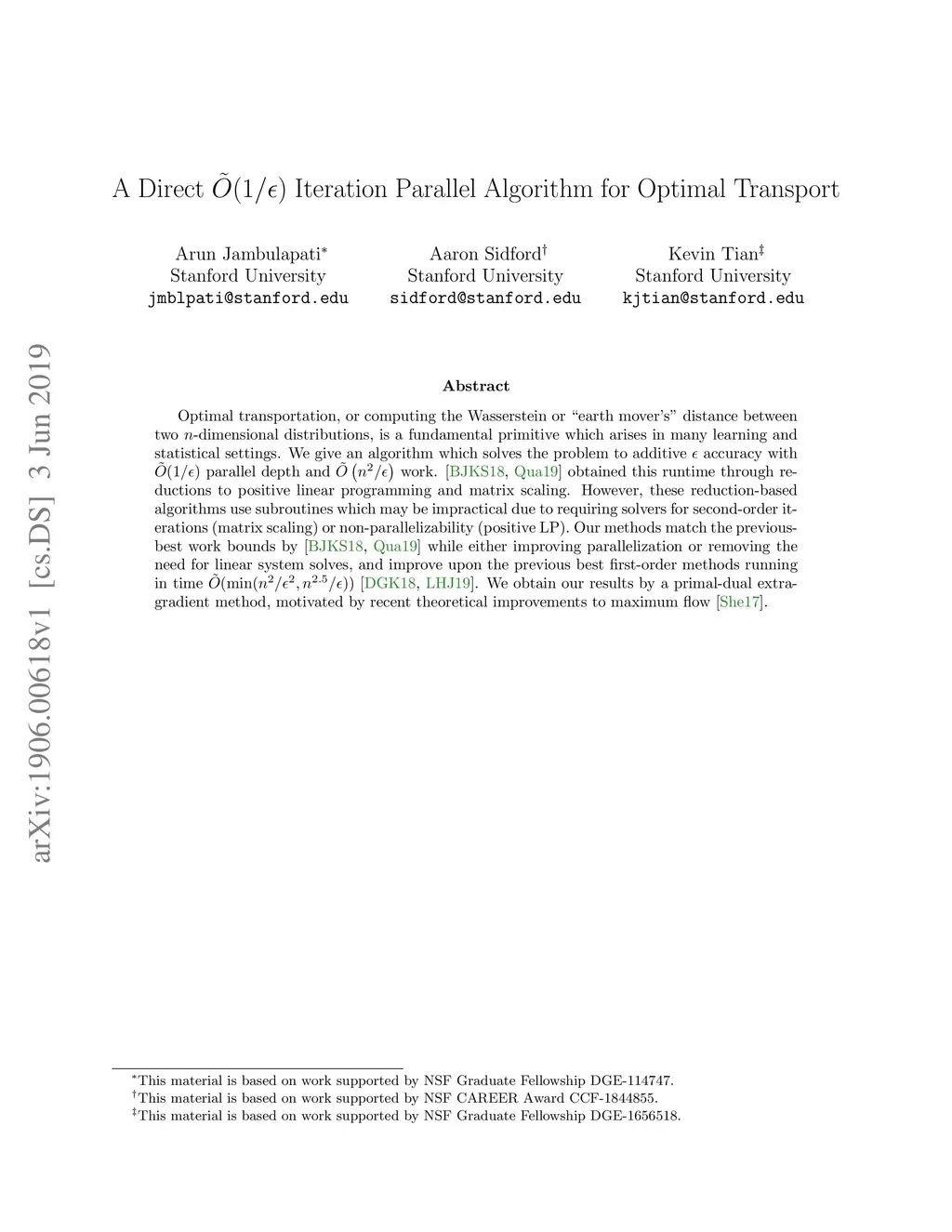Optimal transportation, or computing the Wasserstein or ``earth mover's'' distance between two distributions, is a fundamental primitive which arises in many learning and statistical settings. We give an algorithm which solves this problem to additive with parallel depth, and work. Barring a breakthrough on a long-standing algorithmic open problem, this is optimal for first-order methods. Blanchet et. al. '18, Quanrud '19 obtained similar runtimes through reductions to positive linear programming and matrix scaling. However, these reduction-based algorithms use complicated subroutines which may be deemed impractical due to requiring solvers for second-order iterations (matrix scaling) or non-parallelizability (positive LP). The fastest practical algorithms run in time (Dvurechensky et. al. '18, Lin et. al. '19). We bridge this gap by providing a parallel, first-order, iteration algorithm without worse dependence on dimension, and provide preliminary experimental evidence that our algorithm may enjoy improved practical performance. We obtain this runtime via a primal-dual extragradient method, motivated by recent theoretical improvements to maximum flow (Sherman '17).