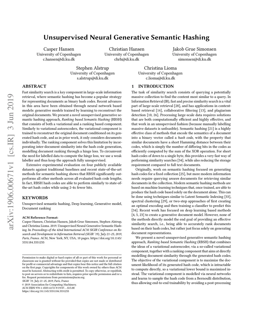 Unsupervised Neural Generative Semantic Hashing