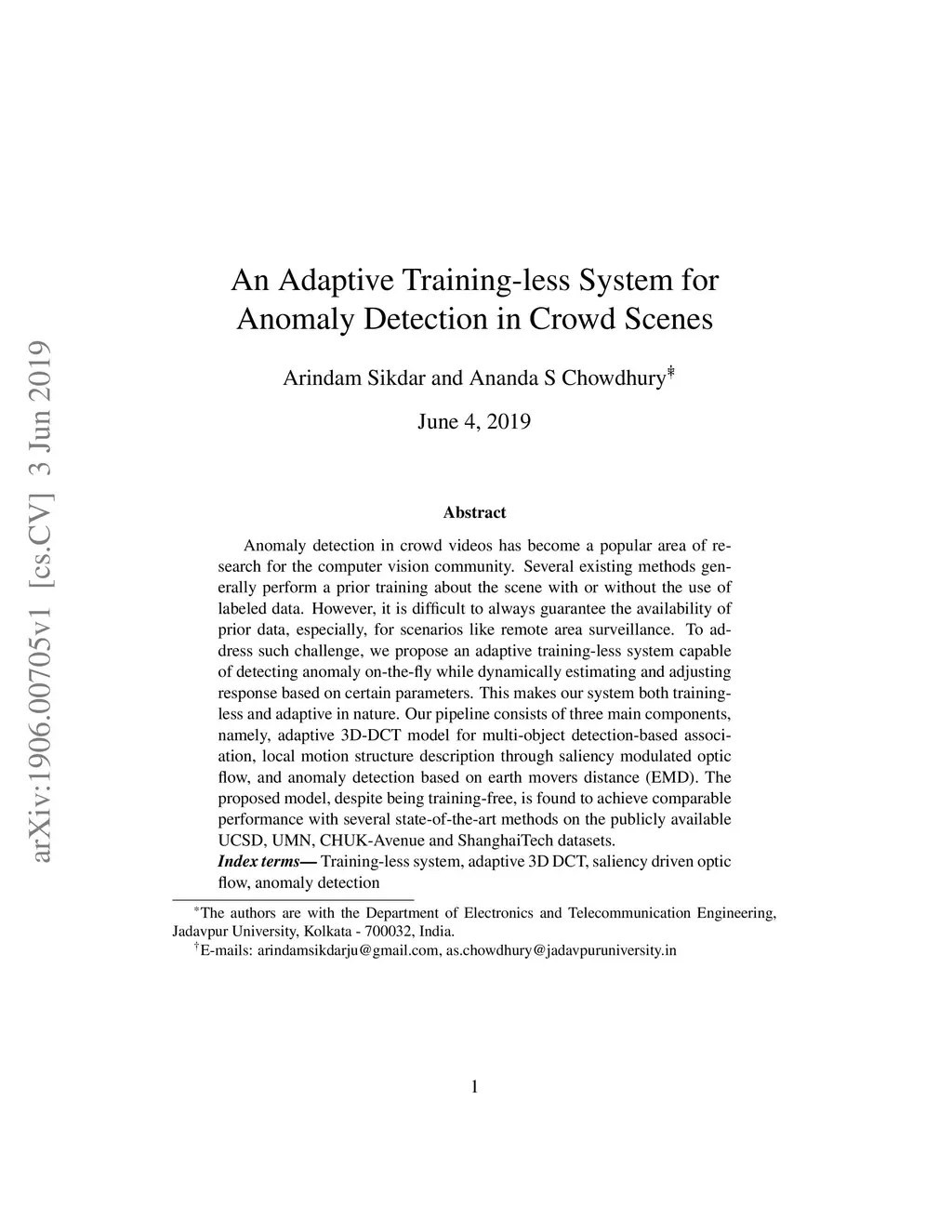 Anomaly detection in crowd videos has become a popular area of research for the computer vision community. Several existing methods generally perform a prior training about the scene with or without the use of labeled data. However, it is difficult to always guarantee the availability of prior data, especially, for scenarios like remote area surveillance. To address such challenge, we propose an adaptive training-less system capable of detecting anomaly on-the-fly while dynamically estimating and adjusting response based on certain parameters. This makes our system both training-less and adaptive in nature. Our pipeline consists of three main components, namely, adaptive 3D-DCT model for multi-object detection-based association, local motion structure description through saliency modulated optic flow, and anomaly detection based on earth movers distance (EMD). The proposed model, despite being training-free, is found to achieve comparable performance with several state-of-the-art methods on the publicly available UCSD, UMN, CHUK-Avenue and ShanghaiTech datasets.