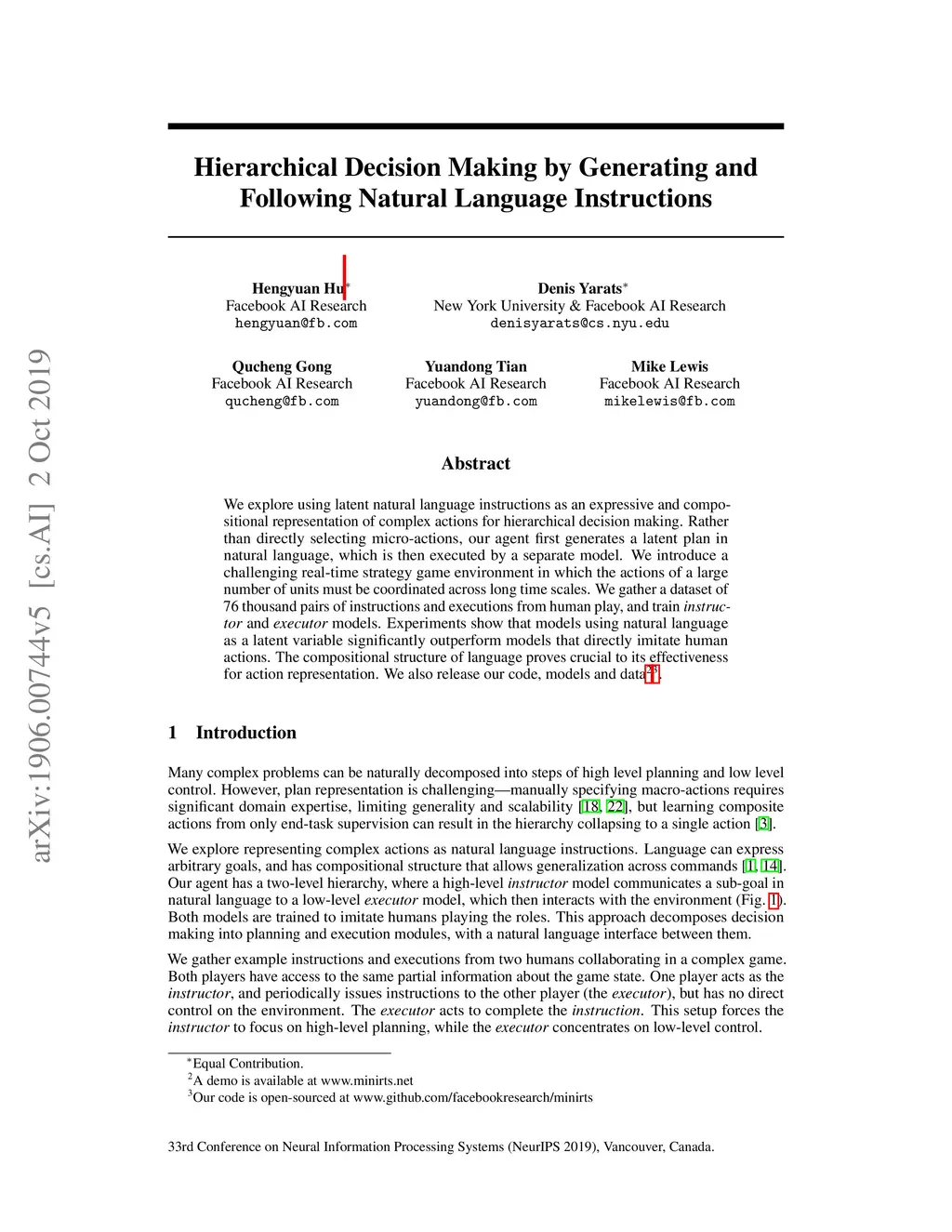 We explore using latent natural language instructions as an expressive and compositional representation of complex actions for hierarchical decision making. Rather than directly selecting micro-actions, our agent first generates a latent plan in natural language, which is then executed by a separate model. We introduce a challenging real-time strategy game environment in which the actions of a large number of units must be coordinated across long time scales. We gather a dataset of 76 thousand pairs of instructions and executions from human play, and train instructor and executor models. Experiments show that models using natural language as a latent variable significantly outperform models that directly imitate human actions. The compositional structure of language proves crucial to its effectiveness for action representation. We also release our code, models and data.