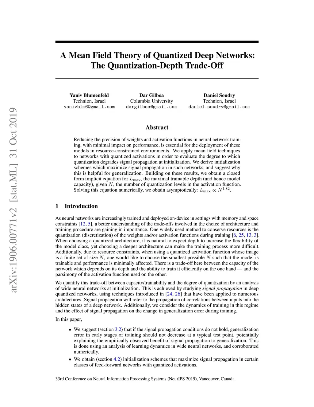 Reducing the precision of weights and activation functions in neural network training, with minimal impact on performance, is essential for the deployment of these models in resource-constrained environments. We apply mean-field techniques to networks with quantized activations in order to evaluate the degree to which quantization degrades signal propagation at initialization. We derive initialization schemes which maximize signal propagation in such networks and suggest why this is helpful for generalization. Building on these results, we obtain a closed form implicit equation for , the maximal trainable depth (and hence model capacity), given , the number of quantization levels in the activation function. Solving this equation numerically, we obtain asymptotically: .