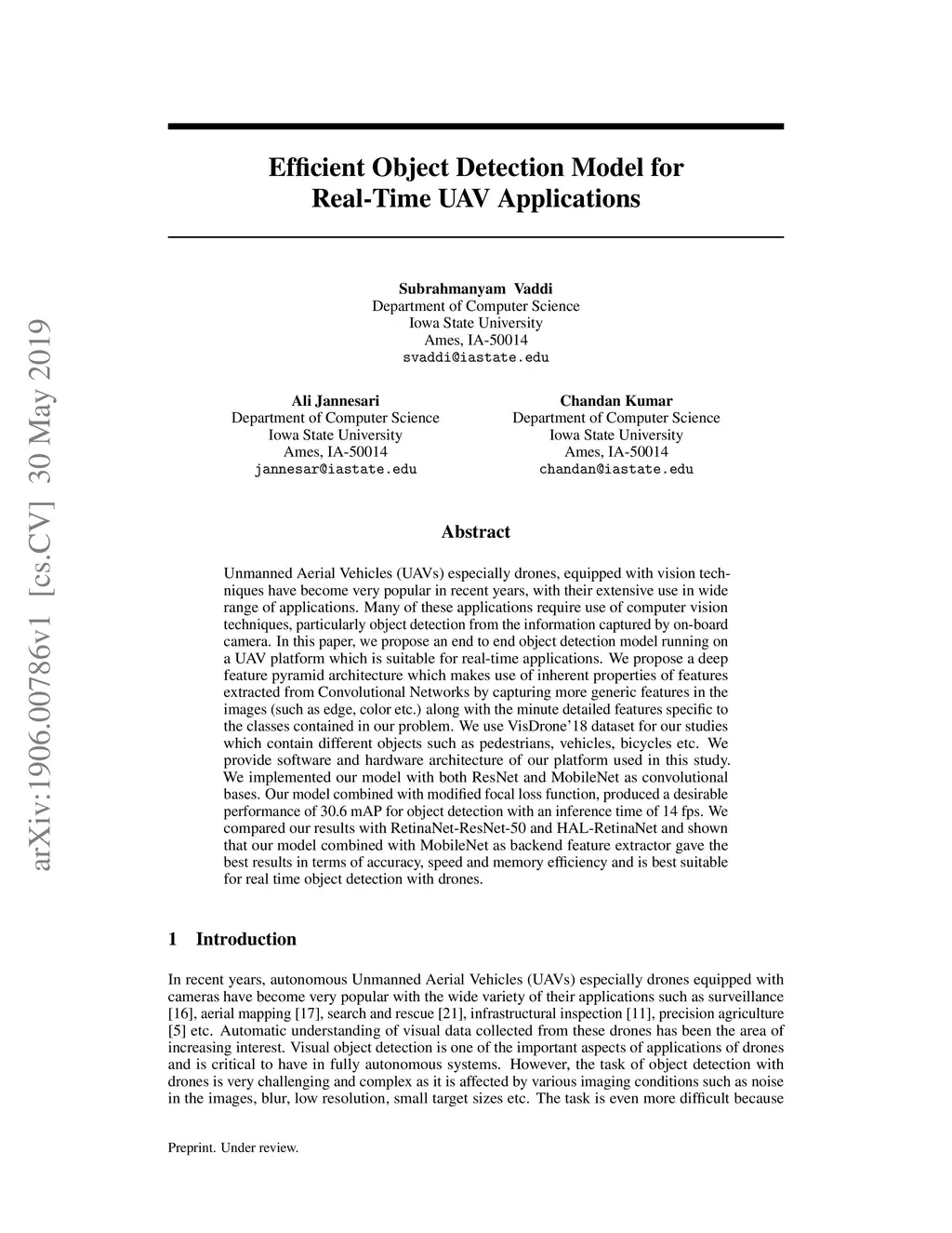 Unmanned Aerial Vehicles (UAVs) especially drones, equipped with vision techniques have become very popular in recent years, with their extensive use in wide range of applications. Many of these applications require use of computer vision techniques, particularly object detection from the information captured by on-board camera. In this paper, we propose an end to end object detection model running on a UAV platform which is suitable for real-time applications. We propose a deep feature pyramid architecture which makes use of inherent properties of features extracted from Convolutional Networks by capturing more generic features in the images (such as edge, color etc.) along with the minute detailed features specific to the classes contained in our problem. We use VisDrone-18 dataset for our studies which contain different objects such as pedestrians, vehicles, bicycles etc. We provide software and hardware architecture of our platform used in this study. We implemented our model with both ResNet and MobileNet as convolutional bases. Our model combined with modified focal loss function, produced a desirable performance of 30.6 mAP for object detection with an inference time of 14 fps. We compared our results with RetinaNet-ResNet-50 and HAL-RetinaNet and shown that our model combined with MobileNet as backend feature extractor gave the best results in terms of accuracy, speed and memory efficiency and is best suitable for real time object detection with drones.