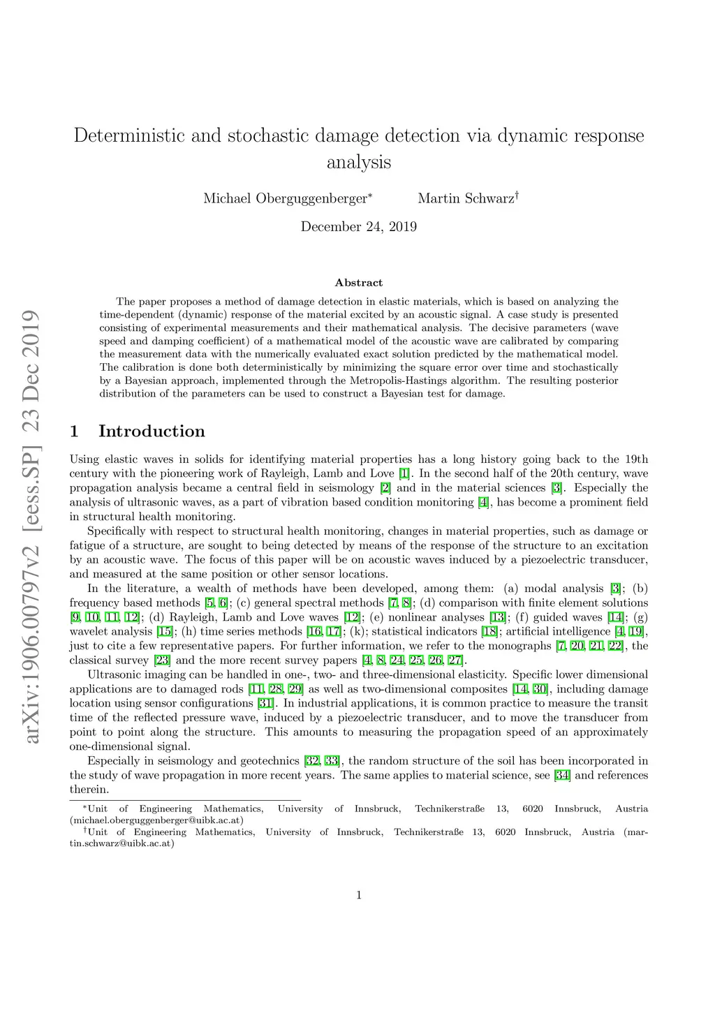 Deterministic and stochastic damage detection via dynamic response