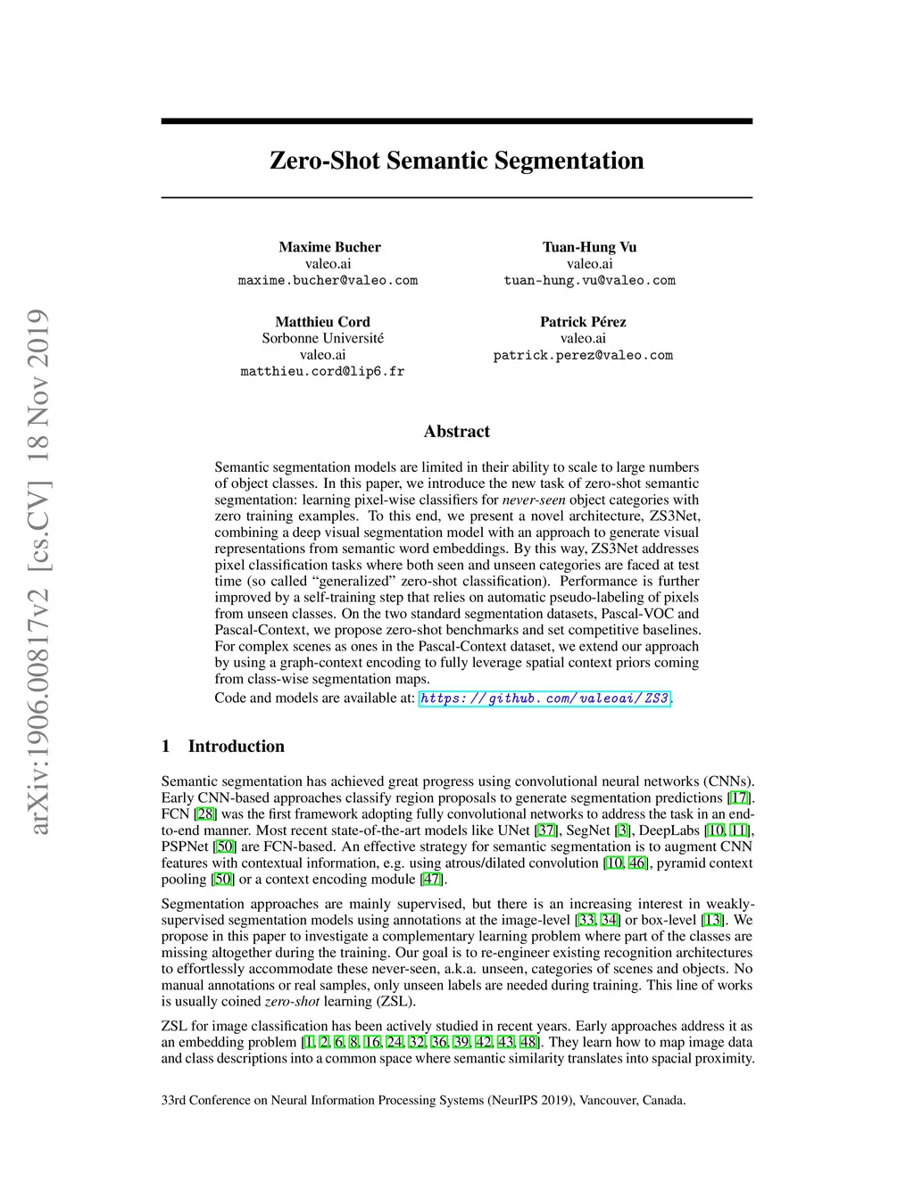 Semantic segmentation models are limited in their ability to scale to large numbers of object classes. In this paper, we introduce the new task of zero-shot semantic segmentation: learning pixel-wise classifiers for never-seen object categories with zero training examples. To this end, we present a novel architecture, ZS3Net, combining a deep visual segmentation model with an approach to generate visual representations from semantic word embeddings. By this way, ZS3Net addresses pixel classification tasks where both seen and unseen categories are faced at test time (so called "generalized" zero-shot classification). Performance is further improved by a self-training step that relies on automatic pseudo-labeling of pixels from unseen classes. On the two standard segmentation datasets, Pascal-VOC and Pascal-Context, we propose zero-shot benchmarks and set competitive baselines. For complex scenes as ones in the Pascal-Context dataset, we extend our approach by using a graph-context encoding to fully leverage spatial context priors coming from class-wise segmentation maps.