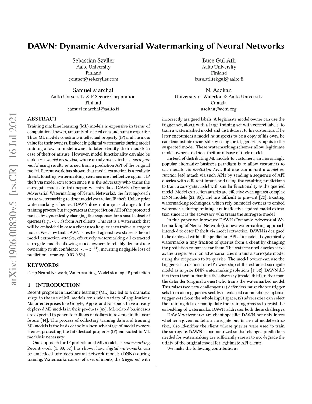 DAWN: Dynamic Adversarial Watermarking of Neural Networks