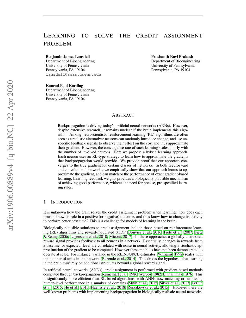 Backpropagation is driving today's artificial neural networks (ANNs). However, despite extensive research, it remains unclear if the brain implements this algorithm. Among neuroscientists, reinforcement learning (RL) algorithms are often seen as a realistic alternative: neurons can randomly introduce change, and use unspecific feedback signals to observe their effect on the cost and thus approximate their gradient. However, the convergence rate of such learning scales poorly with the number of involved neurons. Here we propose a hybrid learning approach. Each neuron uses an RL-type strategy to learn how to approximate the gradients that backpropagation would provide. We provide proof that our approach converges to the true gradient for certain classes of networks. In both feedforward and convolutional networks, we empirically show that our approach learns to approximate the gradient, and can match or the performance of exact gradient-based learning. Learning feedback weights provides a biologically plausible mechanism of achieving good performance, without the need for precise, pre-specified learning rules.
