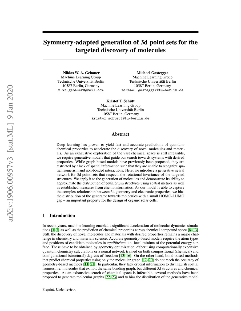 Deep learning has proven to yield fast and accurate predictions of quantum-chemical properties to accelerate the discovery of novel molecules and materials. As an exhaustive exploration of the vast chemical space is still infeasible, we require generative models that guide our search towards systems with desired properties. While graph-based models have previously been proposed, they are restricted by a lack of spatial information such that they are unable to recognize spatial isomerism and non-bonded interactions. Here, we introduce a generative neural network for 3d point sets that respects the rotational invariance of the targeted structures. We apply it to the generation of molecules and demonstrate its ability to approximate the distribution of equilibrium structures using spatial metrics as well as established measures from chemoinformatics. As our model is able to capture the complex relationship between 3d geometry and electronic properties, we bias the distribution of the generator towards molecules with a small HOMO-LUMO gap - an important property for the design of organic solar cells.