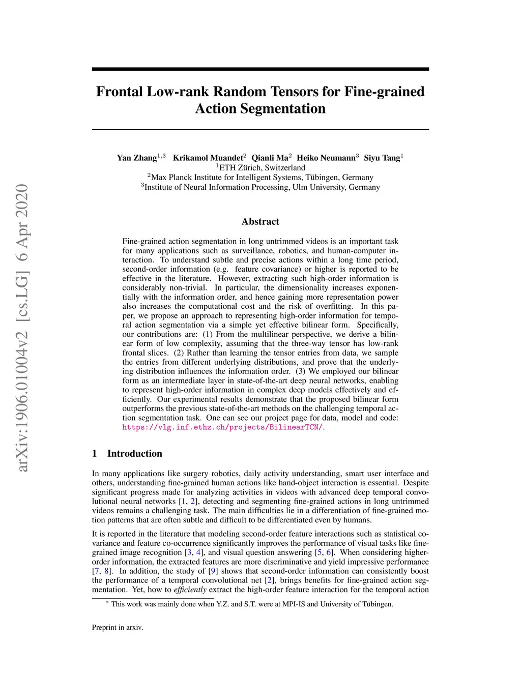 Frontal Low-rank Random Tensors for Fine-grained Action Segmentation