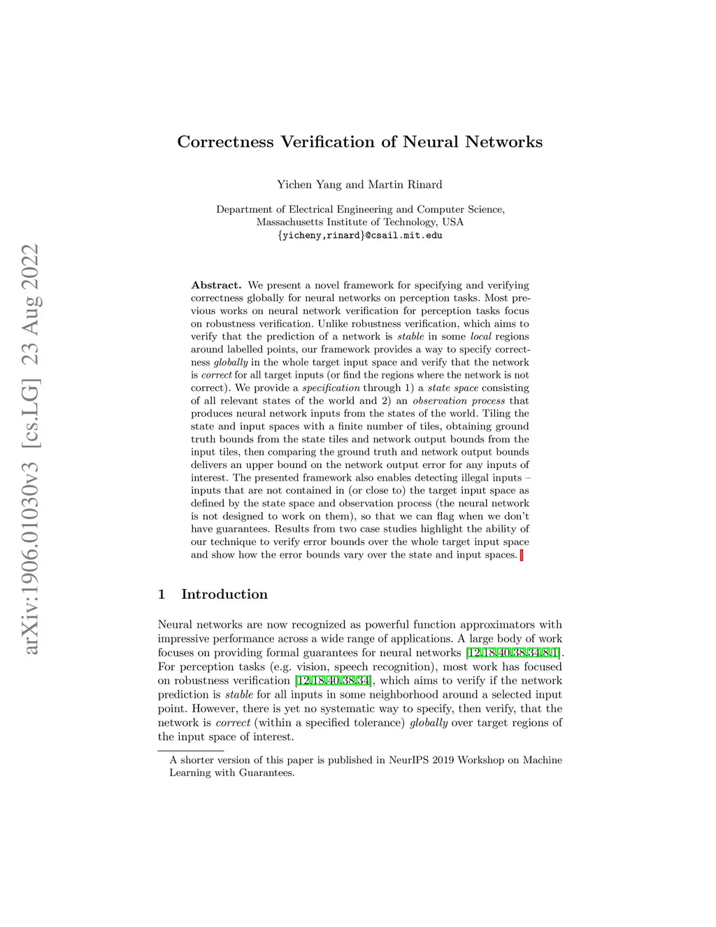 We present a novel framework for specifying and verifying correctness globally for neural networks on perception tasks. Most previous works on neural network verification for perception tasks focus on robustness verification. Unlike robustness verification, which aims to verify that the prediction of a network is stable in some local regions around labelled points, our framework provides a way to specify correctness globally in the whole target input space and verify that the network is correct for all target inputs (or find the regions where the network is not correct). We provide a specification through 1) a state space consisting of all relevant states of the world and 2) an observation process that produces neural network inputs from the states of the world. Tiling the state and input spaces with a finite number of tiles, obtaining ground truth bounds from the state tiles and network output bounds from the input tiles, then comparing the ground truth and network output bounds delivers an upper bound on the network output error for any inputs of interest. The presented framework also enables detecting illegal inputs -- inputs that are not contained in (or close to) the target input space as defined by the state space and observation process (the neural network is not designed to work on them), so that we can flag when we don't have guarantees. Results from two case studies highlight the ability of our technique to verify error bounds over the whole target input space and show how the error bounds vary over the state and input spaces.