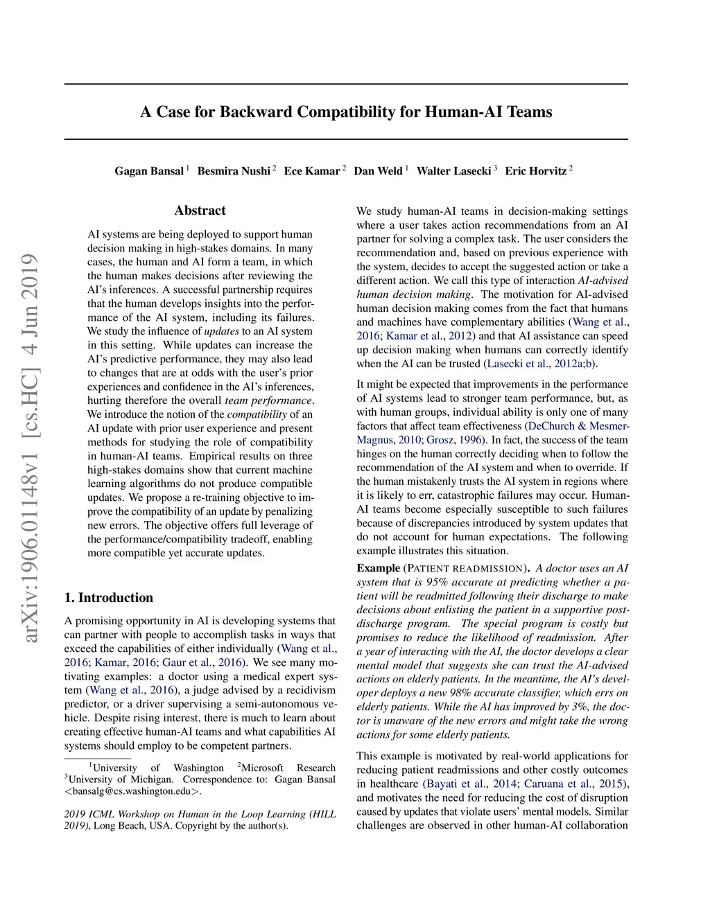 AI systems are being deployed to support human decision making in high-stakes domains. In many cases, the human and AI form a team, in which the human makes decisions after reviewing the AI's inferences. A successful partnership requires that the human develops insights into the performance of the AI system, including its failures. We study the influence of updates to an AI system in this setting. While updates can increase the AI's predictive performance, they may also lead to changes that are at odds with the user's prior experiences and confidence in the AI's inferences, hurting therefore the overall team performance. We introduce the notion of the compatibility of an AI update with prior user experience and present methods for studying the role of compatibility in human-AI teams. Empirical results on three high-stakes domains show that current machine learning algorithms do not produce compatible updates. We propose a re-training objective to improve the compatibility of an update by penalizing new errors. The objective offers full leverage of the performance/compatibility tradeoff, enabling more compatible yet accurate updates.