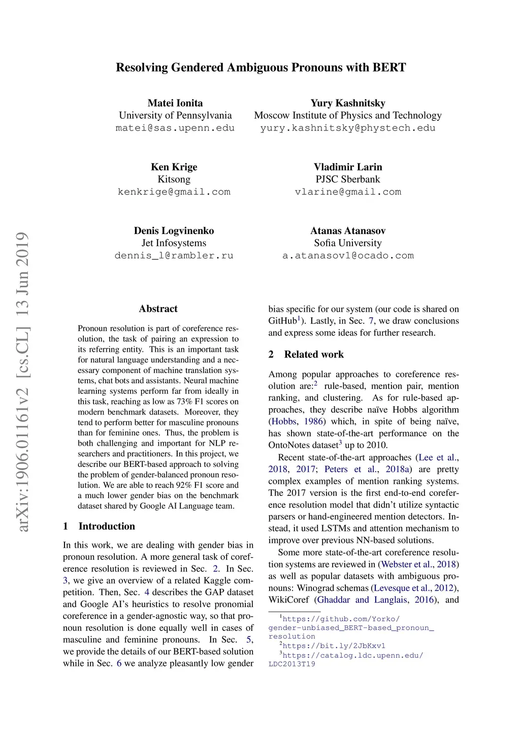 Pronoun resolution is part of coreference resolution, the task of pairing an expression to its referring entity. This is an important task for natural language understanding and a necessary component of machine translation systems, chat bots and assistants. Neural machine learning systems perform far from ideally in this task, reaching as low as 73% F1 scores on modern benchmark datasets. Moreover, they tend to perform better for masculine pronouns than for feminine ones. Thus, the problem is both challenging and important for NLP researchers and practitioners. In this project, we describe our BERT-based approach to solving the problem of gender-balanced pronoun resolution. We are able to reach 92% F1 score and a much lower gender bias on the benchmark dataset shared by Google AI Language team.