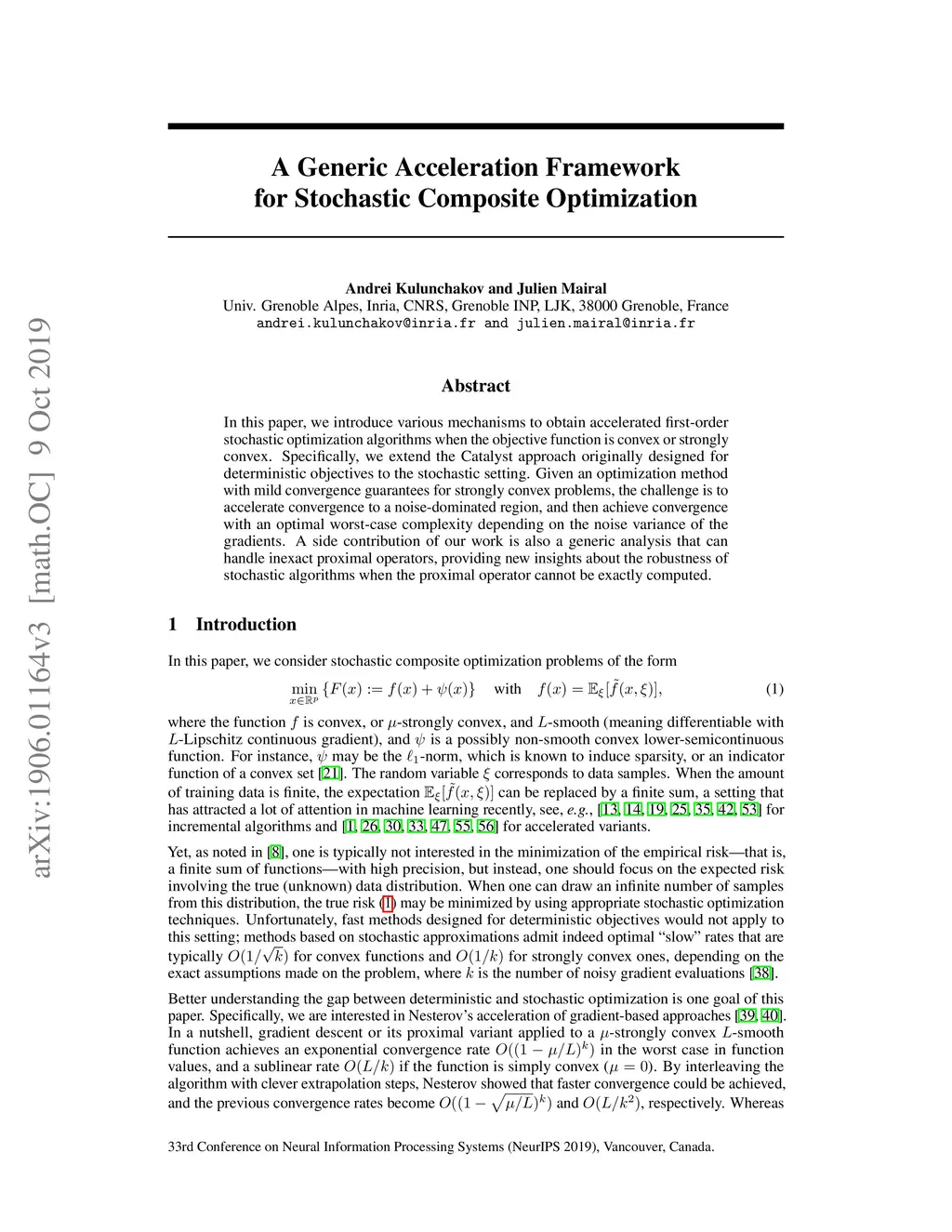 In this paper, we introduce various mechanisms to obtain accelerated first-order stochastic optimization algorithms when the objective function is convex or strongly convex. Specifically, we extend the Catalyst approach originally designed for deterministic objectives to the stochastic setting. Given an optimization method with mild convergence guarantees for strongly convex problems, the challenge is to accelerate convergence to a noise-dominated region, and then achieve convergence with an optimal worst-case complexity depending on the noise variance of the gradients. A side contribution of our work is also a generic analysis that can handle inexact proximal operators, providing new insights about the robustness of stochastic algorithms when the proximal operator cannot be exactly computed.