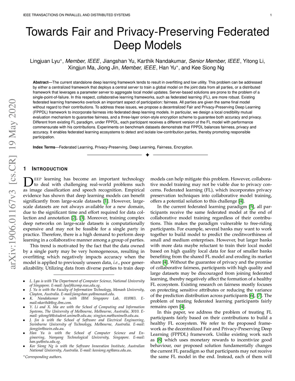 The current standalone deep learning framework tends to result in overfitting and low utility. This problem can be addressed by either a centralized framework that deploys a central server to train a global model on the joint data from all parties, or a distributed framework that leverages a parameter server to aggregate local model updates. Server-based solutions are prone to the problem of a single-point-of-failure. In this respect, collaborative learning frameworks, such as federated learning (FL), are more robust. Existing federated learning frameworks overlook an important aspect of participation: fairness. All parties are given the same final model without regard to their contributions. To address these issues, we propose a decentralized Fair and Privacy-Preserving Deep Learning (FPPDL) framework to incorporate fairness into federated deep learning models. In particular, we design a local credibility mutual evaluation mechanism to guarantee fairness, and a three-layer onion-style encryption scheme to guarantee both accuracy and privacy. Different from existing FL paradigm, under FPPDL, each participant receives a different version of the FL model with performance commensurate with his contributions. Experiments on benchmark datasets demonstrate that FPPDL balances fairness, privacy and accuracy. It enables federated learning ecosystems to detect and isolate low-contribution parties, thereby promoting responsible participation.
