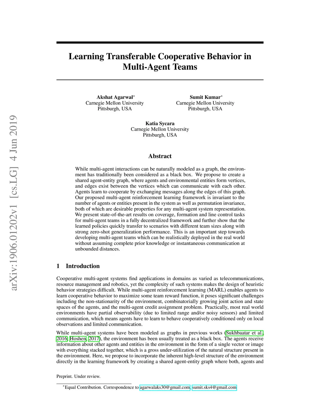 Learning Transferable Cooperative Behavior in Multi-Agent Teams