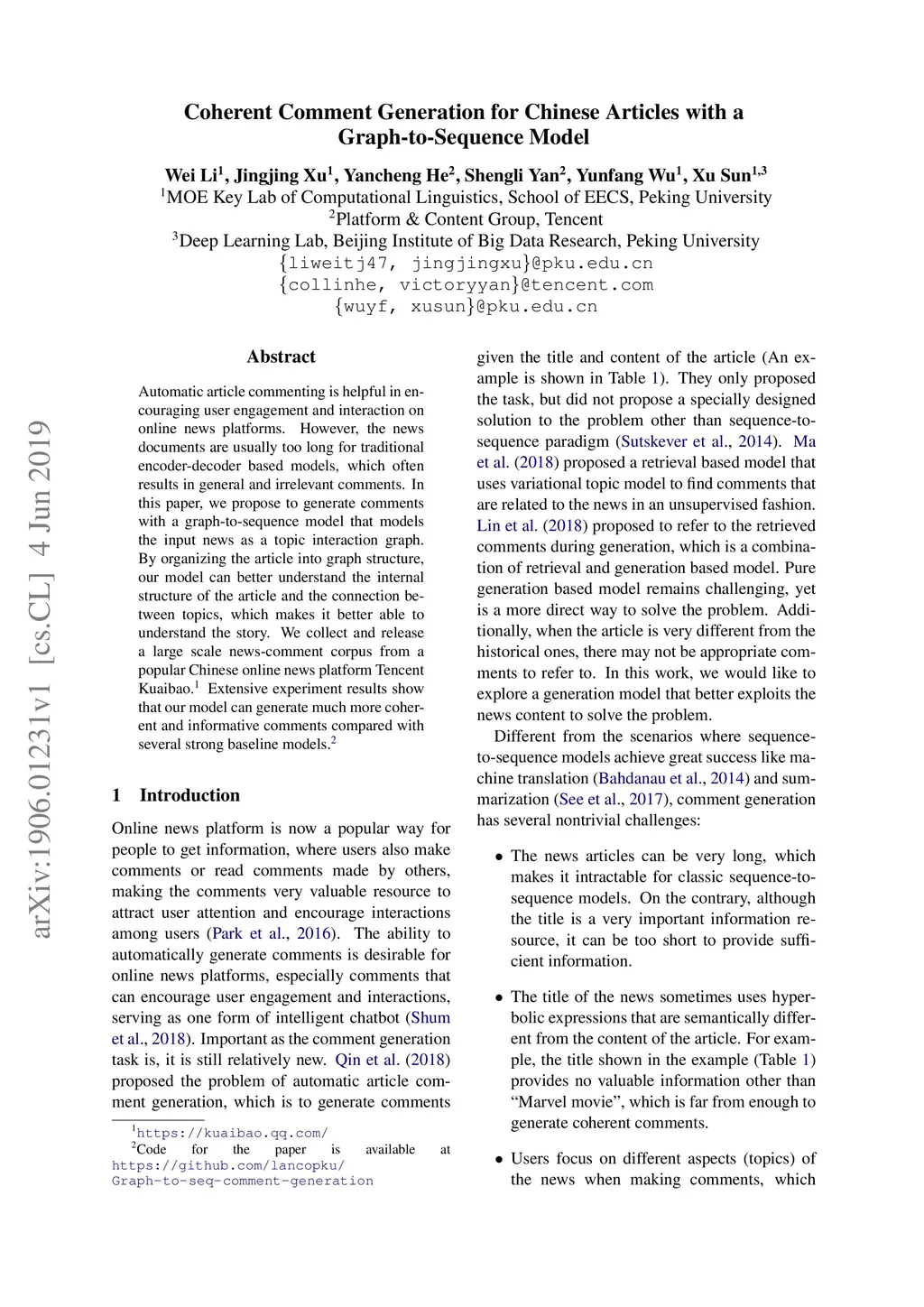 Automatic article commenting is helpful in encouraging user engagement and interaction on online news platforms. However, the news documents are usually too long for traditional encoder-decoder based models, which often results in general and irrelevant comments. In this paper, we propose to generate comments with a graph-to-sequence model that models the input news as a topic interaction graph. By organizing the article into graph structure, our model can better understand the internal structure of the article and the connection between topics, which makes it better able to understand the story. We collect and release a large scale news-comment corpus from a popular Chinese online news platform Tencent Kuaibao. Extensive experiment results show that our model can generate much more coherent and informative comments compared with several strong baseline models.