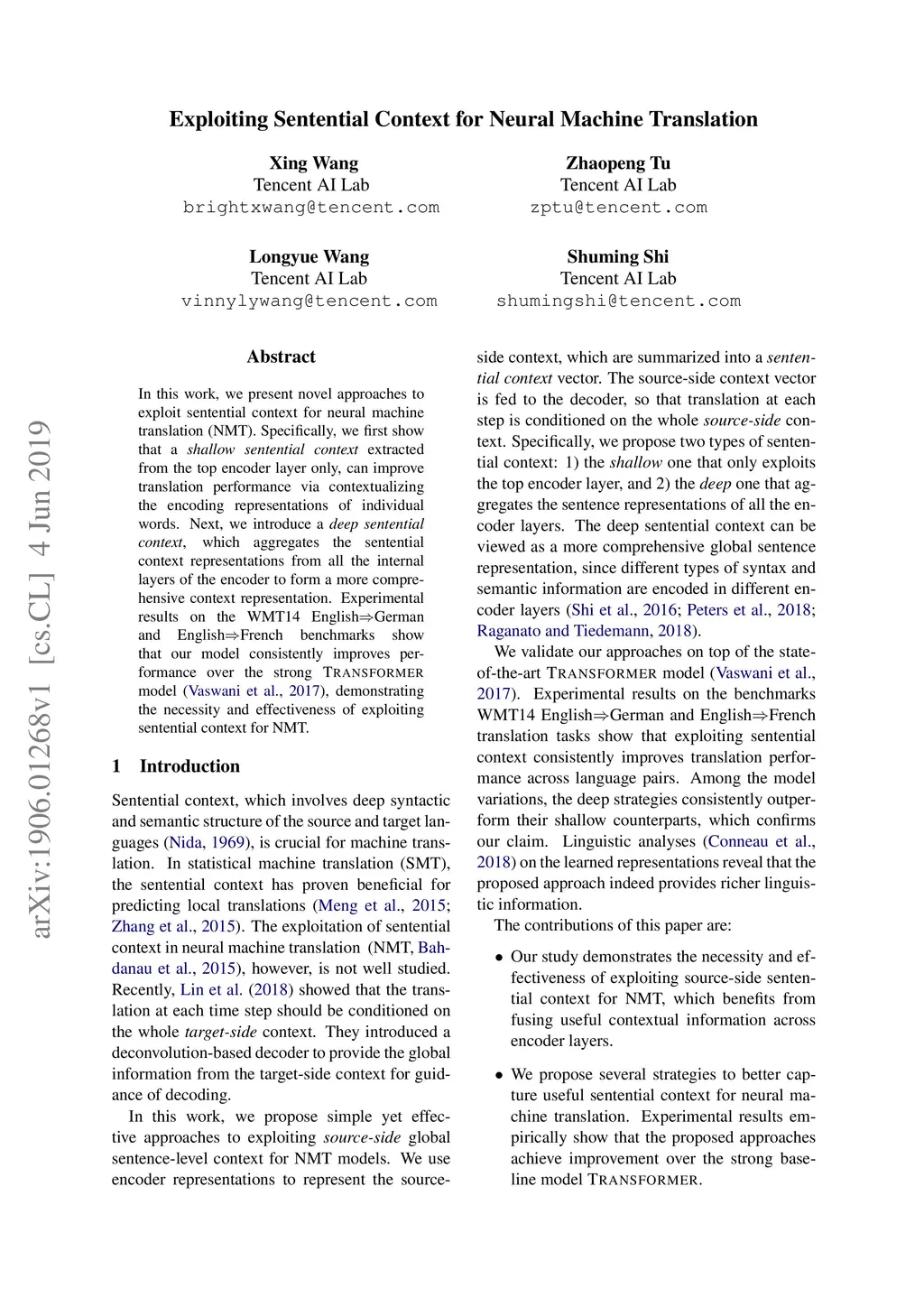 In this work, we present novel approaches to exploit sentential context for neural machine translation (NMT). Specifically, we first show that a shallow sentential context extracted from the top encoder layer only, can improve translation performance via contextualizing the encoding representations of individual words. Next, we introduce a deep sentential context, which aggregates the sentential context representations from all the internal layers of the encoder to form a more comprehensive context representation. Experimental results on the WMT14 English-to-German and English-to-French benchmarks show that our model consistently improves performance over the strong TRANSFORMER model (Vaswani et al., 2017), demonstrating the necessity and effectiveness of exploiting sentential context for NMT.