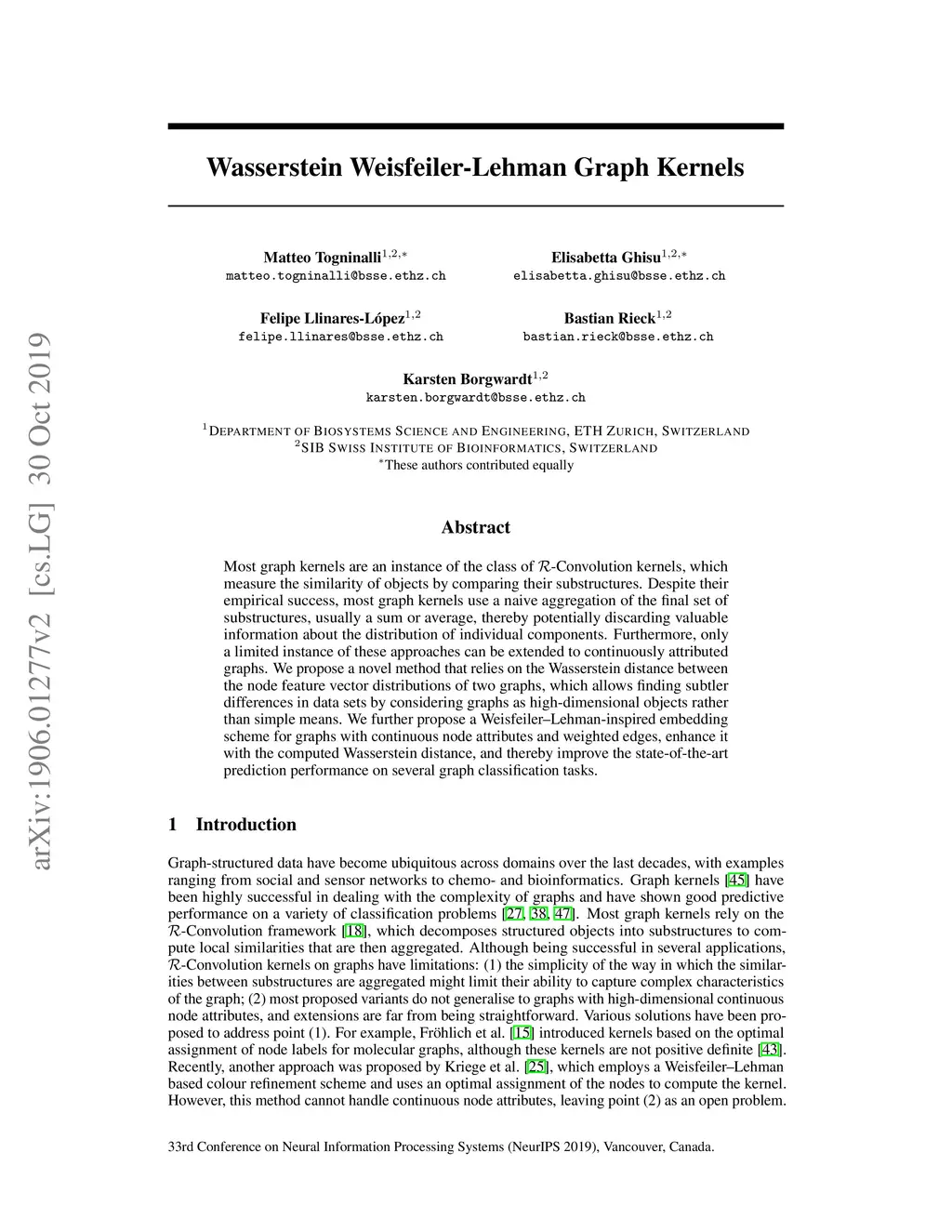 Most graph kernels are an instance of the class of -Convolution kernels, which measure the similarity of objects by comparing their substructures. Despite their empirical success, most graph kernels use a naive aggregation of the final set of substructures, usually a sum or average, thereby potentially discarding valuable information about the distribution of individual components. Furthermore, only a limited instance of these approaches can be extended to continuously attributed graphs. We propose a novel method that relies on the Wasserstein distance between the node feature vector distributions of two graphs, which allows to find subtler differences in data sets by considering graphs as high-dimensional objects, rather than simple means. We further propose a Weisfeiler-Lehman inspired embedding scheme for graphs with continuous node attributes and weighted edges, enhance it with the computed Wasserstein distance, and thus improve the state-of-the-art prediction performance on several graph classification tasks.