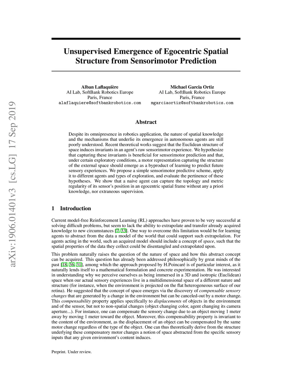 Despite its omnipresence in robotics application, the nature of spatial knowledge and the mechanisms that underlie its emergence in autonomous agents are still poorly understood. Recent theoretical works suggest that the Euclidean structure of space induces invariants in an agent's raw sensorimotor experience. We hypothesize that capturing these invariants is beneficial for sensorimotor prediction and that, under certain exploratory conditions, a motor representation capturing the structure of the external space should emerge as a byproduct of learning to predict future sensory experiences. We propose a simple sensorimotor predictive scheme, apply it to different agents and types of exploration, and evaluate the pertinence of these hypotheses. We show that a naive agent can capture the topology and metric regularity of its sensor's position in an egocentric spatial frame without any a priori knowledge, nor extraneous supervision.
