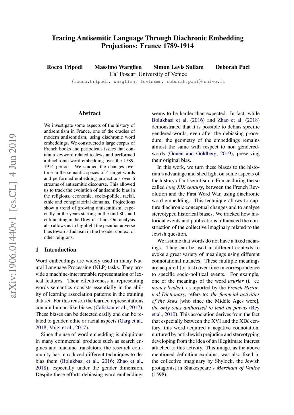 We investigate some aspects of the history of antisemitism in France, one of the cradles of modern antisemitism, using diachronic word embeddings. We constructed a large corpus of French books and periodicals issues that contain a keyword related to Jews and performed a diachronic word embedding over the 1789-1914 period. We studied the changes over time in the semantic spaces of 4 target words and performed embedding projections over 6 streams of antisemitic discourse. This allowed us to track the evolution of antisemitic bias in the religious, economic, socio-politic, racial, ethic and conspiratorial domains. Projections show a trend of growing antisemitism, especially in the years starting in the mid-80s and culminating in the Dreyfus affair. Our analysis also allows us to highlight the peculiar adverse bias towards Judaism in the broader context of other religions.
