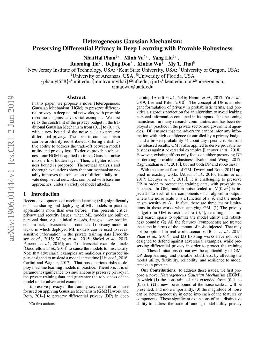 In this paper, we propose a novel Heterogeneous Gaussian Mechanism (HGM) to preserve differential privacy in deep neural networks, with provable robustness against adversarial examples. We first relax the constraint of the privacy budget in the traditional Gaussian Mechanism from (0, 1] to (0, \infty), with a new bound of the noise scale to preserve differential privacy. The noise in our mechanism can be arbitrarily redistributed, offering a distinctive ability to address the trade-off between model utility and privacy loss. To derive provable robustness, our HGM is applied to inject Gaussian noise into the first hidden layer. Then, a tighter robustness bound is proposed. Theoretical analysis and thorough evaluations show that our mechanism notably improves the robustness of differentially private deep neural networks, compared with baseline approaches, under a variety of model attacks.