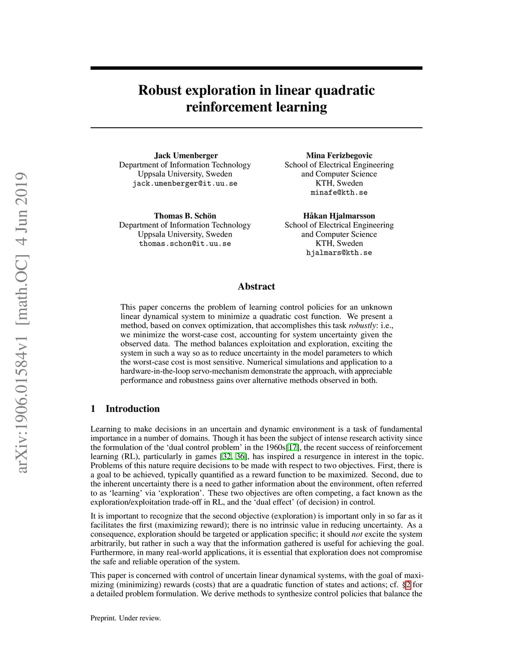 This paper concerns the problem of learning control policies for an unknown linear dynamical system to minimize a quadratic cost function. We present a method, based on convex optimization, that accomplishes this task robustly: i.e., we minimize the worst-case cost, accounting for system uncertainty given the observed data. The method balances exploitation and exploration, exciting the system in such a way so as to reduce uncertainty in the model parameters to which the worst-case cost is most sensitive. Numerical simulations and application to a hardware-in-the-loop servo-mechanism demonstrate the approach, with appreciable performance and robustness gains over alternative methods observed in both.