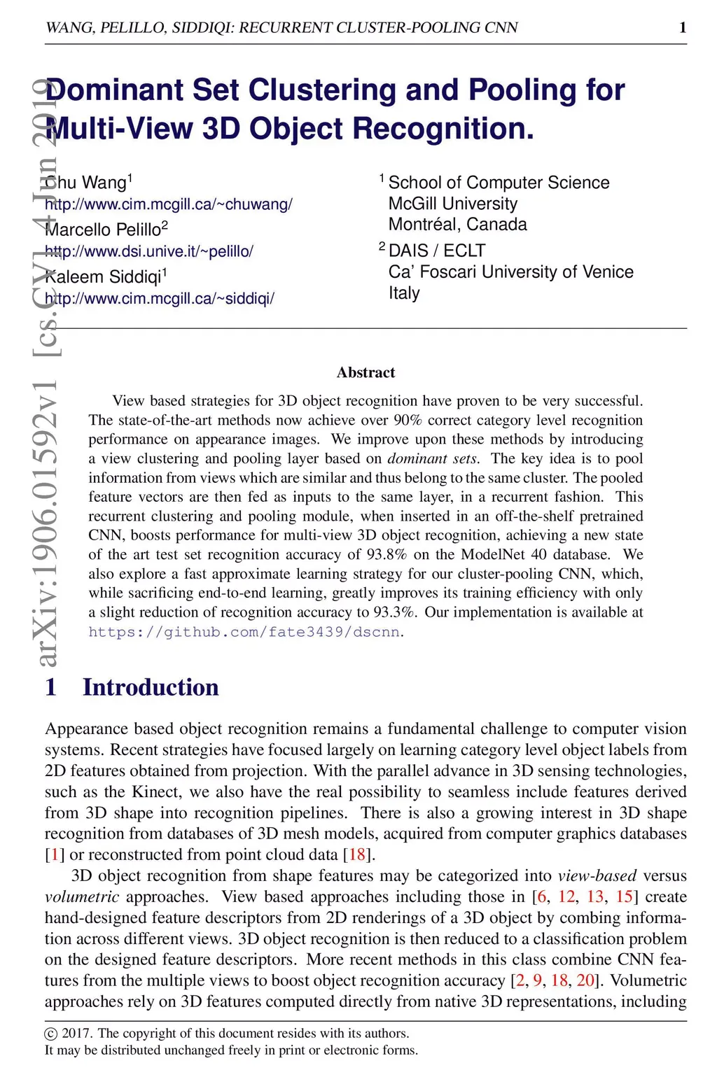 View based strategies for 3D object recognition have proven to be very successful. The state-of-the-art methods now achieve over 90% correct category level recognition performance on appearance images. We improve upon these methods by introducing a view clustering and pooling layer based on dominant sets. The key idea is to pool information from views which are similar and thus belong to the same cluster. The pooled feature vectors are then fed as inputs to the same layer, in a recurrent fashion. This recurrent clustering and pooling module, when inserted in an off-the-shelf pretrained CNN, boosts performance for multi-view 3D object recognition, achieving a new state of the art test set recognition accuracy of 93.8% on the ModelNet 40 database. We also explore a fast approximate learning strategy for our cluster-pooling CNN, which, while sacrificing end-to-end learning, greatly improves its training efficiency with only a slight reduction of recognition accuracy to 93.3%. Our implementation is available at https://github.com/fate3439/dscnn.