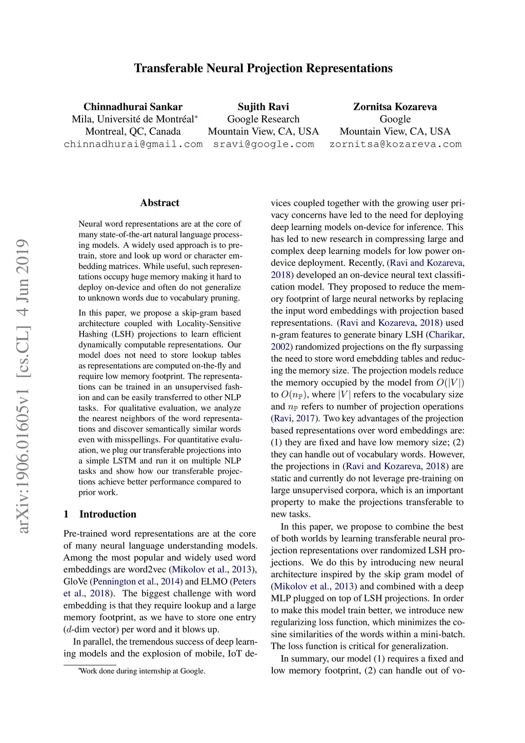Neural word representations are at the core of many state-of-the-art natural language processing models. A widely used approach is to pre-train, store and look up word or character embedding matrices. While useful, such representations occupy huge memory making it hard to deploy on-device and often do not generalize to unknown words due to vocabulary pruning. In this paper, we propose a skip-gram based architecture coupled with Locality-Sensitive Hashing (LSH) projections to learn efficient dynamically computable representations. Our model does not need to store lookup tables as representations are computed on-the-fly and require low memory footprint. The representations can be trained in an unsupervised fashion and can be easily transferred to other NLP tasks. For qualitative evaluation, we analyze the nearest neighbors of the word representations and discover semantically similar words even with misspellings. For quantitative evaluation, we plug our transferable projections into a simple LSTM and run it on multiple NLP tasks and show how our transferable projections achieve better performance compared to prior work.