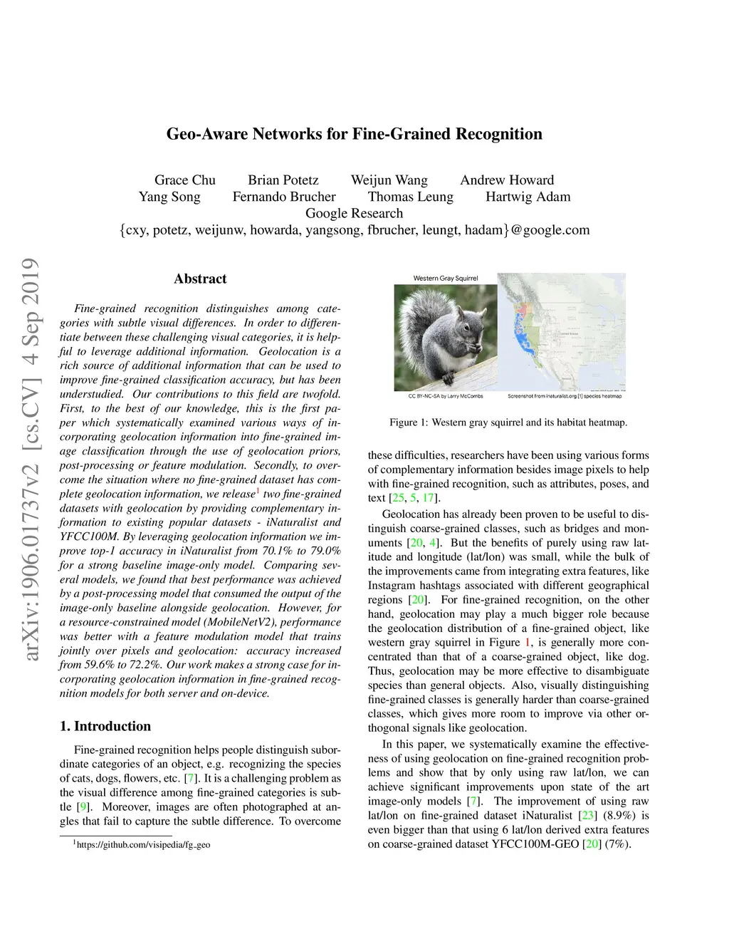 Fine-grained recognition distinguishes among categories with subtle visual differences. In order to differentiate between these challenging visual categories, it is helpful to leverage additional information. Geolocation is a rich source of additional information that can be used to improve fine-grained classification accuracy, but has been understudied. Our contributions to this field are twofold. First, to the best of our knowledge, this is the first paper which systematically examined various ways of incorporating geolocation information into fine-grained image classification through the use of geolocation priors, post-processing or feature modulation. Secondly, to overcome the situation where no fine-grained dataset has complete geolocation information, we release two fine-grained datasets with geolocation by providing complementary information to existing popular datasets - iNaturalist and YFCC100M. By leveraging geolocation information we improve top-1 accuracy in iNaturalist from 70.1% to 79.0% for a strong baseline image-only model. Comparing several models, we found that best performance was achieved by a post-processing model that consumed the output of the image-only baseline alongside geolocation. However, for a resource-constrained model (MobileNetV2), performance was better with a feature modulation model that trains jointly over pixels and geolocation: accuracy increased from 59.6% to 72.2%. Our work makes a strong case for incorporating geolocation information in fine-grained recognition models for both server and on-device.