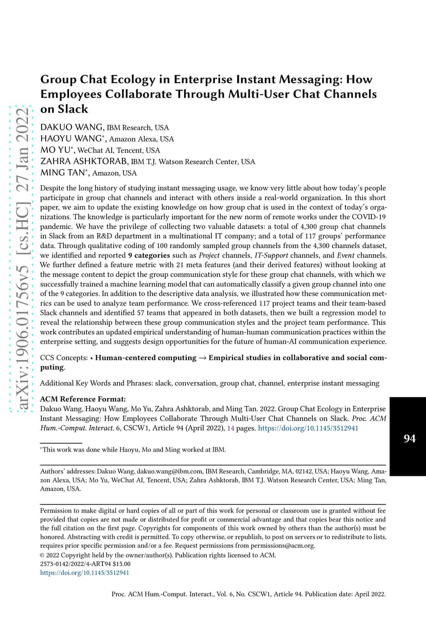 Despite the long history of studying instant messaging usage, we know very little about how today's people participate in group chat channels and interact with others inside a real-world organization. In this short paper, we aim to update the existing knowledge on how group chat is used in the context of today's organizations. The knowledge is particularly important for the new norm of remote works under the COVID-19 pandemic. We have the privilege of collecting two valuable datasets: a total of 4,300 group chat channels in Slack from an R&D department in a multinational IT company; and a total of 117 groups' performance data. Through qualitative coding of 100 randomly sampled group channels from the 4,300 channels dataset, we identified and reported 9 categories such as Project channels, IT-Support channels, and Event channels. We further defined a feature metric with 21 meta features (and their derived features) without looking at the message content to depict the group communication style for these group chat channels, with which we successfully trained a machine learning model that can automatically classify a given group channel into one of the 9 categories. In addition to the descriptive data analysis, we illustrated how these communication metrics can be used to analyze team performance. We cross-referenced 117 project teams and their team-based Slack channels and identified 57 teams that appeared in both datasets, then we built a regression model to reveal the relationship between these group communication styles and the project team performance. This work contributes an updated empirical understanding of human-human communication practices within the enterprise setting, and suggests design opportunities for the future of human-AI communication experience.
