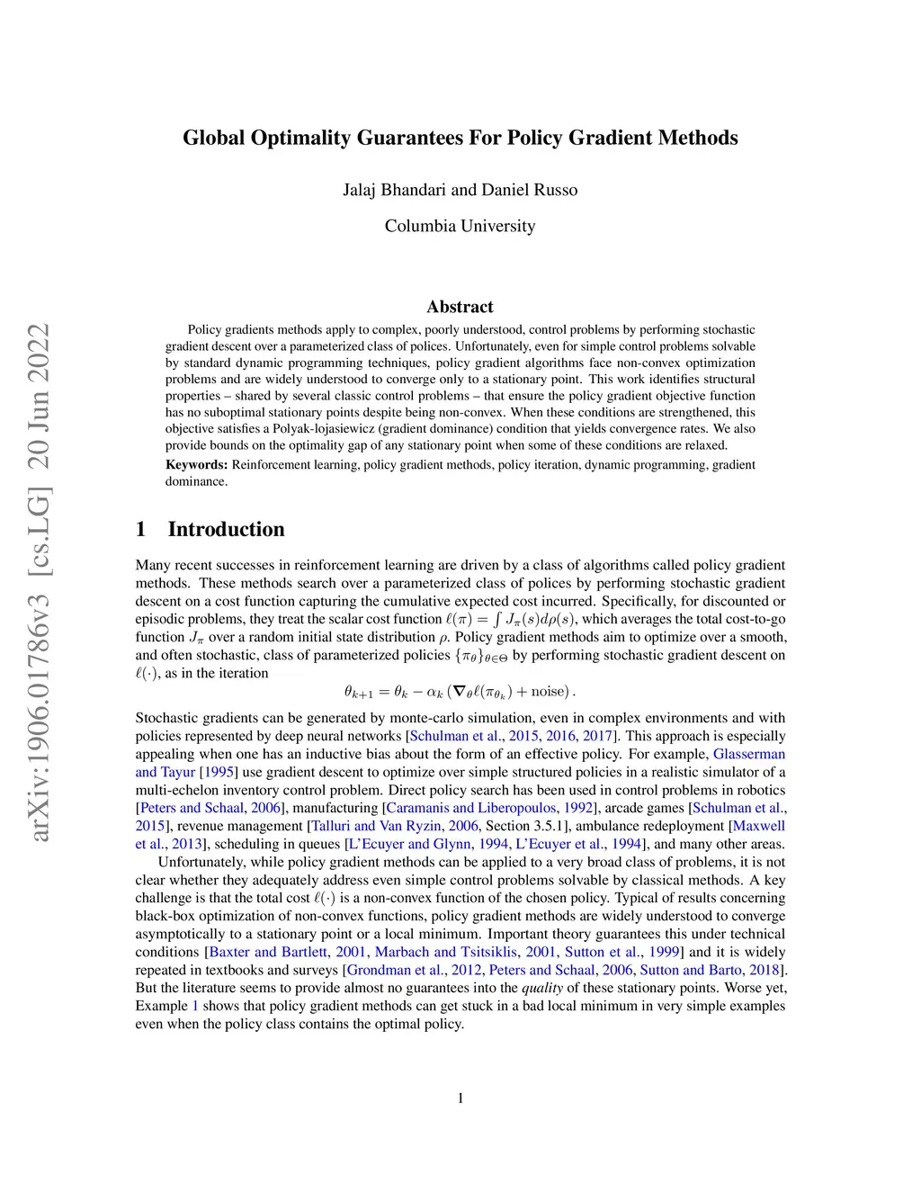 Policy gradients methods apply to complex, poorly understood, control problems by performing stochastic gradient descent over a parameterized class of polices. Unfortunately, even for simple control problems solvable by standard dynamic programming techniques, policy gradient algorithms face non-convex optimization problems and are widely understood to converge only to a stationary point. This work identifies structural properties -- shared by several classic control problems -- that ensure the policy gradient objective function has no suboptimal stationary points despite being non-convex. When these conditions are strengthened, this objective satisfies a Polyak-lojasiewicz (gradient dominance) condition that yields convergence rates. We also provide bounds on the optimality gap of any stationary point when some of these conditions are relaxed.