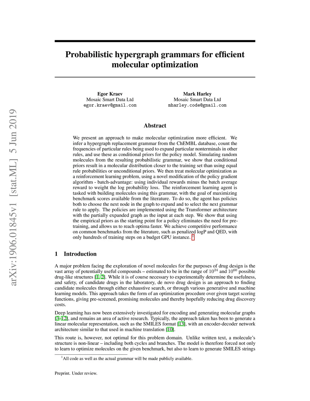 We present an approach to make molecular optimization more efficient. We infer a hypergraph replacement grammar from the ChEMBL database, count the frequencies of particular rules being used to expand particular nonterminals in other rules, and use these as conditional priors for the policy model. Simulating random molecules from the resulting probabilistic grammar, we show that conditional priors result in a molecular distribution closer to the training set than using equal rule probabilities or unconditional priors. We then treat molecular optimization as a reinforcement learning problem, using a novel modification of the policy gradient algorithm - batch-advantage: using individual rewards minus the batch average reward to weight the log probability loss. The reinforcement learning agent is tasked with building molecules using this grammar, with the goal of maximizing benchmark scores available from the literature. To do so, the agent has policies both to choose the next node in the graph to expand and to select the next grammar rule to apply. The policies are implemented using the Transformer architecture with the partially expanded graph as the input at each step. We show that using the empirical priors as the starting point for a policy eliminates the need for pre-training, and allows us to reach optima faster. We achieve competitive performance on common benchmarks from the literature, such as penalized logP and QED, with only hundreds of training steps on a budget GPU instance.