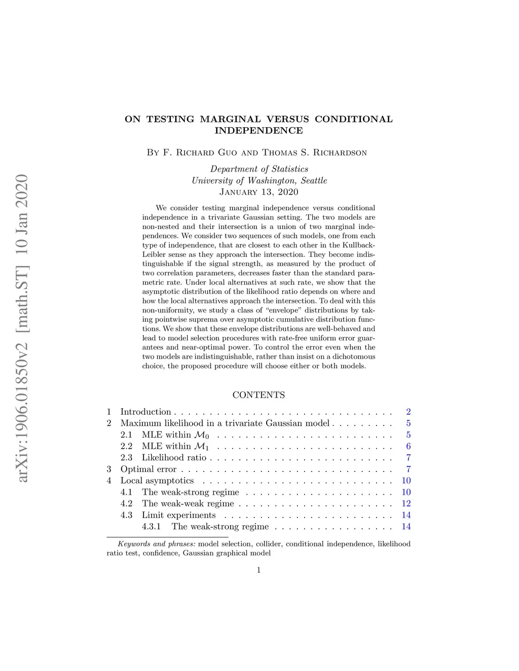 We consider testing marginal independence versus conditional independence in a trivariate Gaussian setting. The two models are non-nested and their intersection is a union of two marginal independences. We consider two sequences of such models, one from each type of independence, that are closest to each other in the Kullback-Leibler sense as they approach the intersection. They become indistinguishable if the signal strength, as measured by the product of two correlation parameters, decreases faster than the standard parametric rate. Under local alternatives at such rate, we show that the asymptotic distribution of the likelihood ratio depends on where and how the local alternatives approach the intersection. To deal with this non-uniformity, we study a class of "envelope" distributions by taking pointwise suprema over asymptotic cumulative distribution functions. We show that these envelope distributions are well-behaved and lead to model selection procedures with rate-free uniform error guarantees and near-optimal power. To control the error even when the two models are indistinguishable, rather than insist on a dichotomous choice, the proposed procedure will choose either or both models.