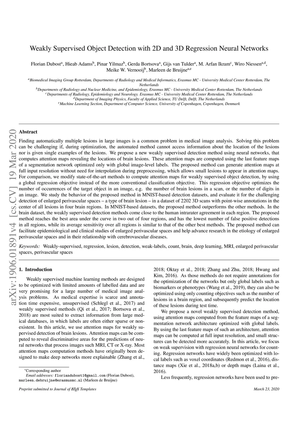 Finding automatically multiple lesions in large images is a common problem in medical image analysis. Solving this problem can be challenging if, during optimization, the automated method cannot access information about the location of the lesions nor is given single examples of the lesions. We propose a new weakly supervised detection method using neural networks, that computes attention maps revealing the locations of brain lesions. These attention maps are computed using the last feature maps of a segmentation network optimized only with global image-level labels. The proposed method can generate attention maps at full input resolution without need for interpolation during preprocessing, which allows small lesions to appear in attention maps. For comparison, we modify state-of-the-art methods to compute attention maps for weakly supervised object detection, by using a global regression objective instead of the more conventional classification objective. This regression objective optimizes the number of occurrences of the target object in an image, e.g. the number of brain lesions in a scan, or the number of digits in an image. We study the behavior of the proposed method in MNIST-based detection datasets, and evaluate it for the challenging detection of enlarged perivascular spaces - a type of brain lesion - in a dataset of 2202 3D scans with point-wise annotations in the center of all lesions in four brain regions. In the brain dataset, the weakly supervised detection methods come close to the human intrarater agreement in each region. The proposed method reaches the best area under the curve in two out of four regions, and has the lowest number of false positive detections in all regions, while its average sensitivity over all regions is similar to that of the other best methods. The proposed method can facilitate epidemiological and clinical studies of enlarged perivascular spaces.
