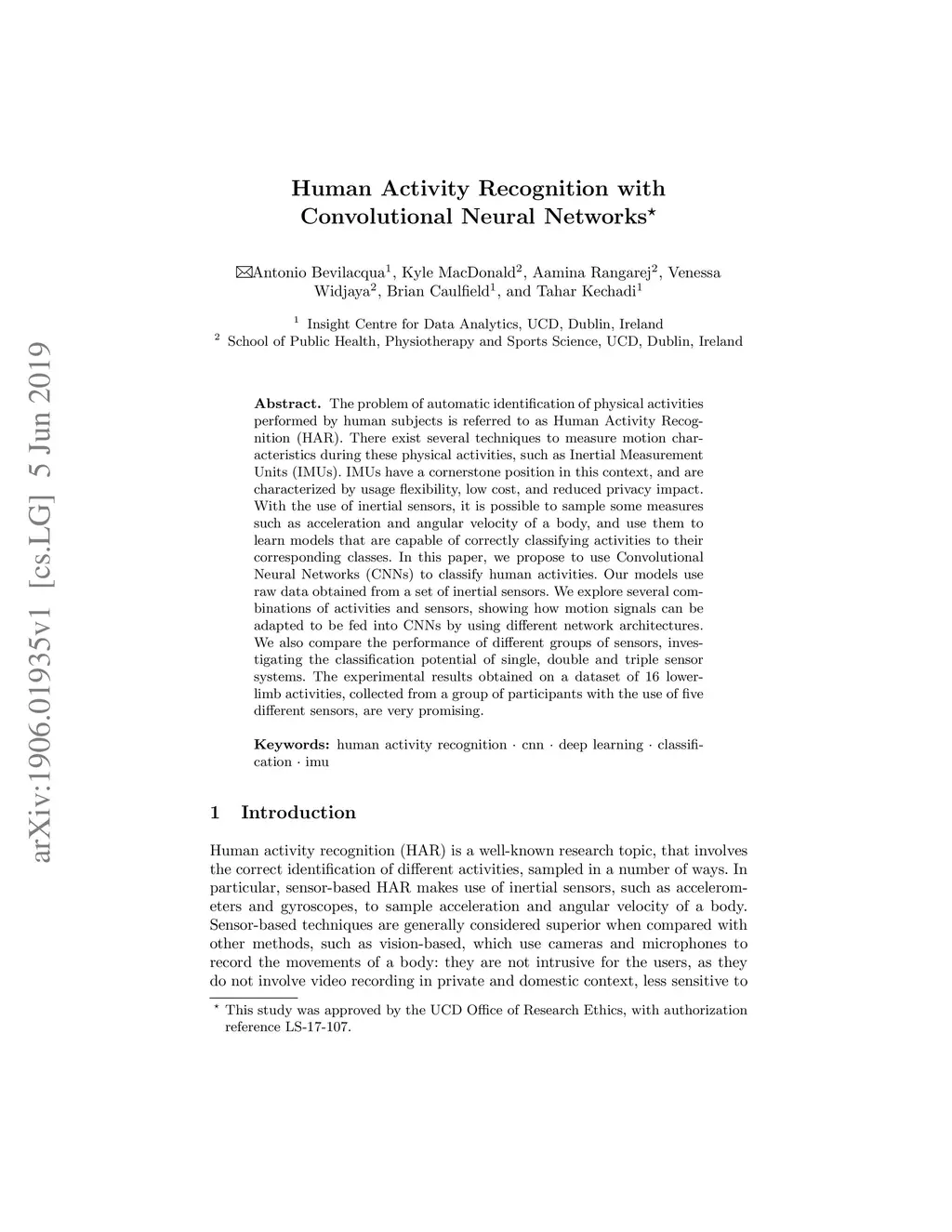The problem of automatic identification of physical activities performed by human subjects is referred to as Human Activity Recognition (HAR). There exist several techniques to measure motion characteristics during these physical activities, such as Inertial Measurement Units (IMUs). IMUs have a cornerstone position in this context, and are characterized by usage flexibility, low cost, and reduced privacy impact. With the use of inertial sensors, it is possible to sample some measures such as acceleration and angular velocity of a body, and use them to learn models that are capable of correctly classifying activities to their corresponding classes. In this paper, we propose to use Convolutional Neural Networks (CNNs) to classify human activities. Our models use raw data obtained from a set of inertial sensors. We explore several combinations of activities and sensors, showing how motion signals can be adapted to be fed into CNNs by using different network architectures. We also compare the performance of different groups of sensors, investigating the classification potential of single, double and triple sensor systems. The experimental results obtained on a dataset of 16 lower-limb activities, collected from a group of participants with the use of five different sensors, are very promising.