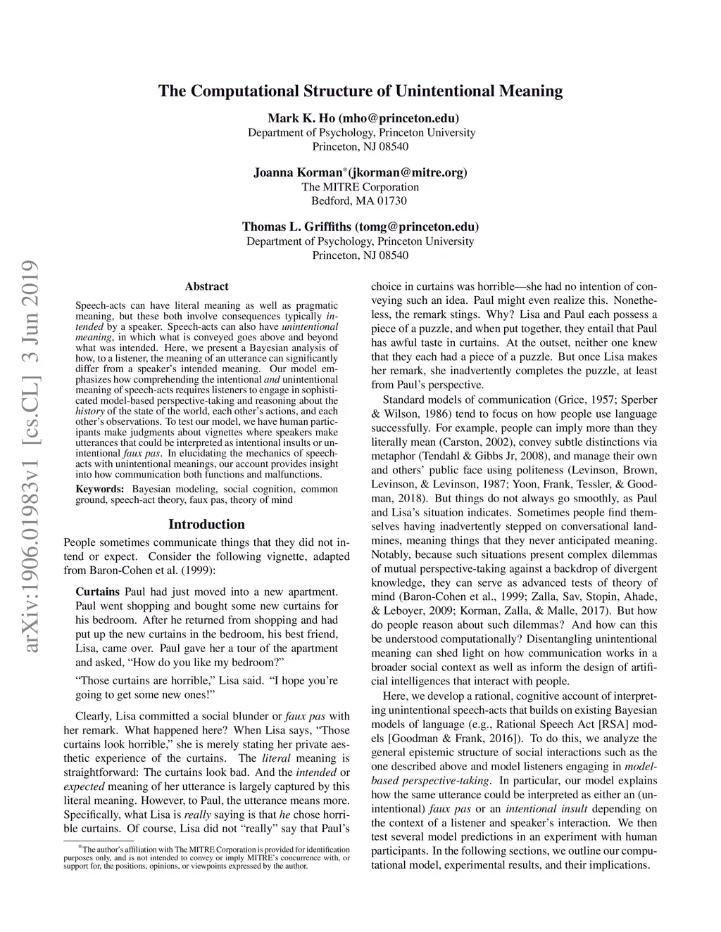 Speech-acts can have literal meaning as well as pragmatic meaning, but these both involve consequences typically intended by a speaker. Speech-acts can also have unintentional meaning, in which what is conveyed goes above and beyond what was intended. Here, we present a Bayesian analysis of how, to a listener, the meaning of an utterance can significantly differ from a speaker's intended meaning. Our model emphasizes how comprehending the intentional and unintentional meaning of speech-acts requires listeners to engage in sophisticated model-based perspective-taking and reasoning about the history of the state of the world, each other's actions, and each other's observations. To test our model, we have human participants make judgments about vignettes where speakers make utterances that could be interpreted as intentional insults or unintentional faux pas. In elucidating the mechanics of speech-acts with unintentional meanings, our account provides insight into how communication both functions and malfunctions.