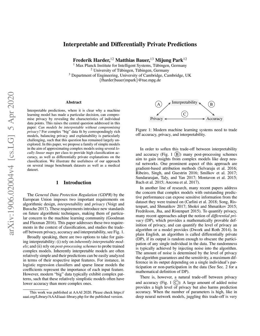 Interpretable predictions, where it is clear why a machine learning model has made a particular decision, can compromise privacy by revealing the characteristics of individual data points. This raises the central question addressed in this paper: Can models be interpretable without compromising privacy? For complex big data fit by correspondingly rich models, balancing privacy and explainability is particularly challenging, such that this question has remained largely unexplored. In this paper, we propose a family of simple models in the aim of approximating complex models using several locally linear maps per class to provide high classification accuracy, as well as differentially private explanations on the classification. We illustrate the usefulness of our approach on several image benchmark datasets as well as a medical dataset.