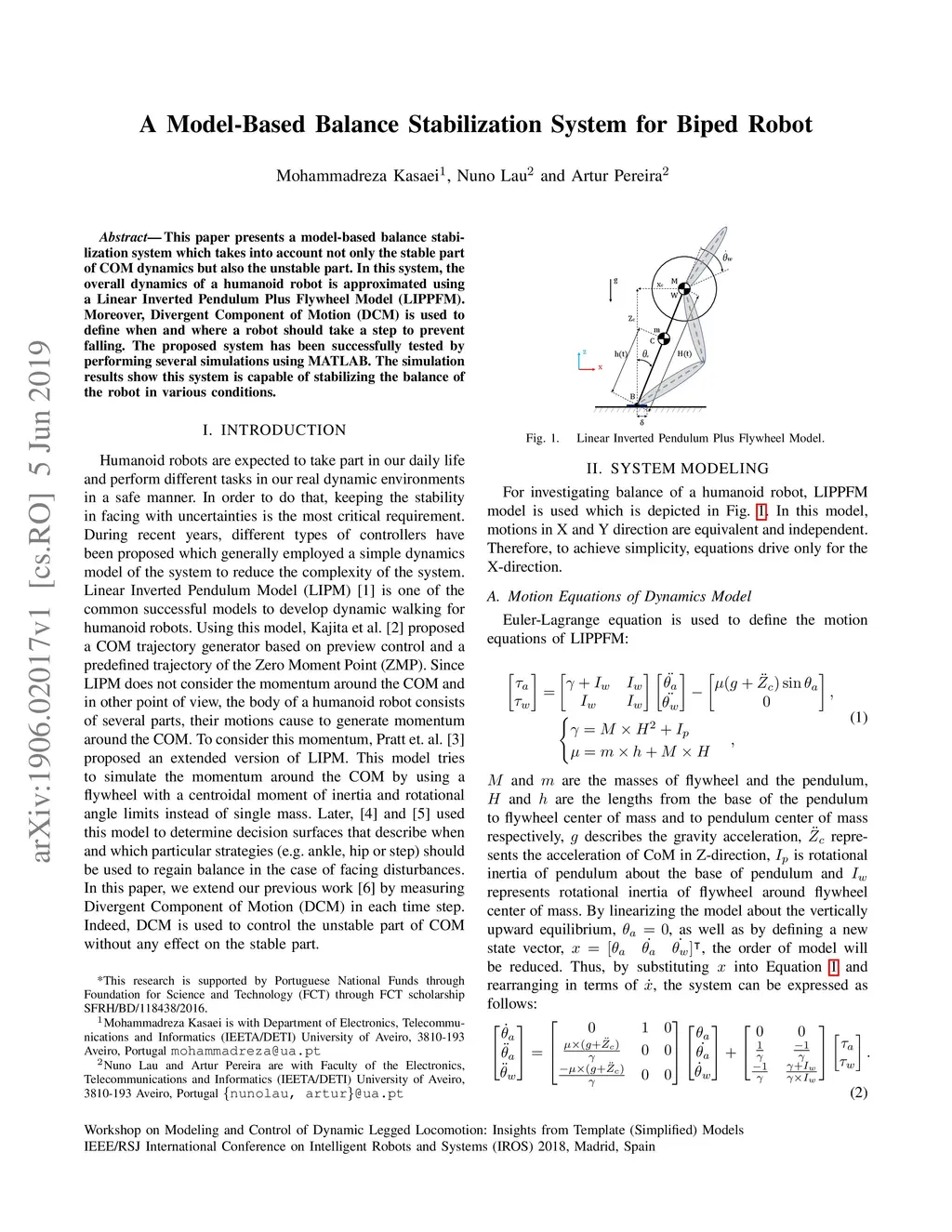 This paper presents a model-based balance stabilization system which takes into account not only the stable part of COM dynamics but also the unstable part. In this system, the overall dynamics of a humanoid robot is approximated using a Linear Inverted Pendulum Plus Flywheel Model (LIPPFM). Moreover, Divergent Component of Motion~(DCM) is used to define when and where a robot should take a step to prevent falling. The proposed system has been successfully tested by performing several simulations using MATLAB. The simulation results show this system is capable of stabilizing the balance of the robot in various conditions.