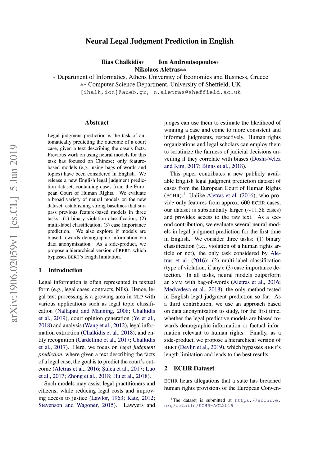 Legal judgment prediction is the task of automatically predicting the outcome of a court case, given a text describing the case's facts. Previous work on using neural models for this task has focused on Chinese; only feature-based models (e.g., using bags of words and topics) have been considered in English. We release a new English legal judgment prediction dataset, containing cases from the European Court of Human Rights. We evaluate a broad variety of neural models on the new dataset, establishing strong baselines that surpass previous feature-based models in three tasks: (1) binary violation classification; (2) multi-label classification; (3) case importance prediction. We also explore if models are biased towards demographic information via data anonymization. As a side-product, we propose a hierarchical version of BERT, which bypasses BERT's length limitation.