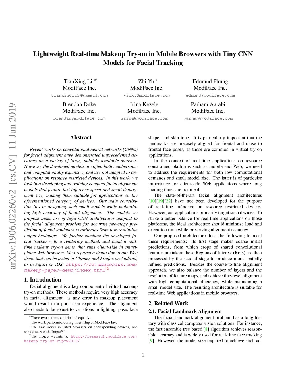 Recent works on convolutional neural networks (CNNs) for facial alignment have demonstrated unprecedented accuracy on a variety of large, publicly available datasets. However, the developed models are often both cumbersome and computationally expensive, and are not adapted to applications on resource restricted devices. In this work, we look into developing and training compact facial alignment models that feature fast inference speed and small deployment size, making them suitable for applications on the aforementioned category of devices. Our main contribution lies in designing such small models while maintaining high accuracy of facial alignment. The models we propose make use of light CNN architectures adapted to the facial alignment problem for accurate two-stage prediction of facial landmark coordinates from low-resolution output heatmaps. We further combine the developed facial tracker with a rendering method, and build a real-time makeup try-on demo that runs client-side in smartphone Web browsers. More results and demo are in our project page: http://research.modiface.com/makeup-try-on-cvprw2019/