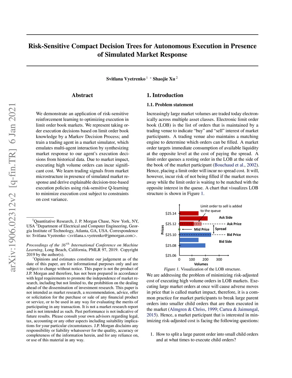 We demonstrate an application of risk-sensitive reinforcement learning to optimizing execution in limit order book markets. We represent taking order execution decisions based on limit order book knowledge by a Markov Decision Process; and train a trading agent in a market simulator, which emulates multi-agent interaction by synthesizing market response to our agent's execution decisions from historical data. Due to market impact, executing high volume orders can incur significant cost. We learn trading signals from market microstructure in presence of simulated market response and derive explainable decision-tree-based execution policies using risk-sensitive Q-learning to minimize execution cost subject to constraints on cost variance.