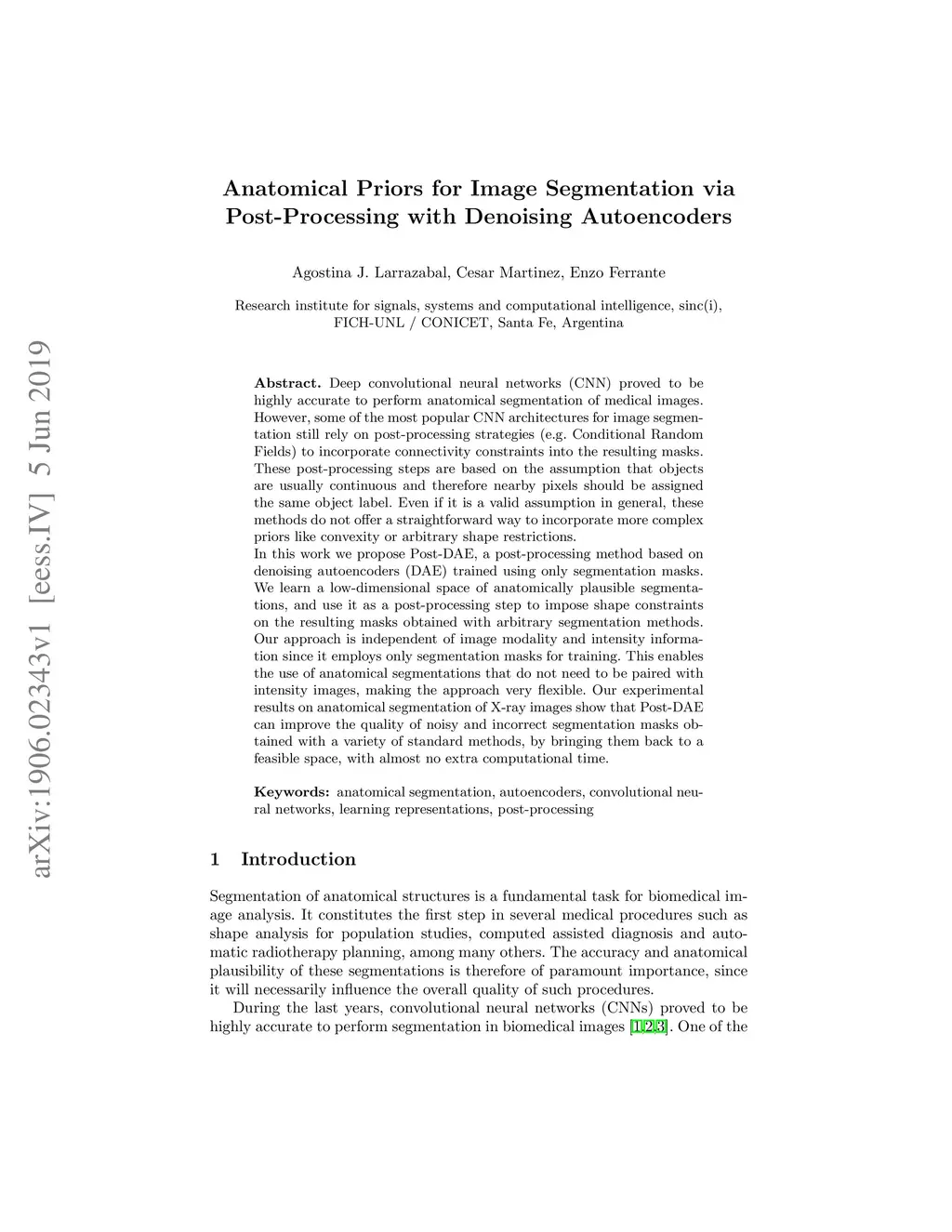 Deep convolutional neural networks (CNN) proved to be highly accurate to perform anatomical segmentation of medical images. However, some of the most popular CNN architectures for image segmentation still rely on post-processing strategies (e.g. Conditional Random Fields) to incorporate connectivity constraints into the resulting masks. These post-processing steps are based on the assumption that objects are usually continuous and therefore nearby pixels should be assigned the same object label. Even if it is a valid assumption in general, these methods do not offer a straightforward way to incorporate more complex priors like convexity or arbitrary shape restrictions. In this work we propose Post-DAE, a post-processing method based on denoising autoencoders (DAE) trained using only segmentation masks. We learn a low-dimensional space of anatomically plausible segmentations, and use it as a post-processing step to impose shape constraints on the resulting masks obtained with arbitrary segmentation methods. Our approach is independent of image modality and intensity information since it employs only segmentation masks for training. This enables the use of anatomical segmentations that do not need to be paired with intensity images, making the approach very flexible. Our experimental results on anatomical segmentation of X-ray images show that Post-DAE can improve the quality of noisy and incorrect segmentation masks obtained with a variety of standard methods, by bringing them back to a feasible space, with almost no extra computational time.