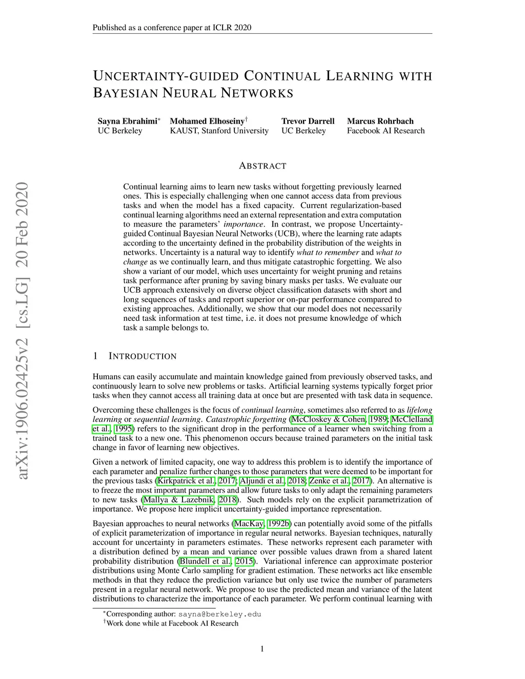 Continual learning aims to learn new tasks without forgetting previously learned ones. This is especially challenging when one cannot access data from previous tasks and when the model has a fixed capacity. Current regularization-based continual learning algorithms need an external representation and extra computation to measure the parameters' \textit{importance}. In contrast, we propose Uncertainty-guided Continual Bayesian Neural Networks (UCB), where the learning rate adapts according to the uncertainty defined in the probability distribution of the weights in networks. Uncertainty is a natural way to identify \textit{what to remember} and \textit{what to change} as we continually learn, and thus mitigate catastrophic forgetting. We also show a variant of our model, which uses uncertainty for weight pruning and retains task performance after pruning by saving binary masks per tasks. We evaluate our UCB approach extensively on diverse object classification datasets with short and long sequences of tasks and report superior or on-par performance compared to existing approaches. Additionally, we show that our model does not necessarily need task information at test time, i.e. it does not presume knowledge of which task a sample belongs to.