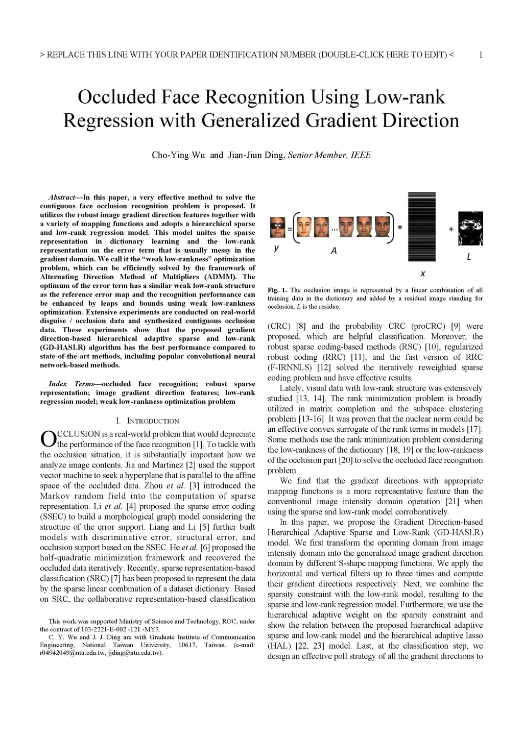 In this paper, a very effective method to solve the contiguous face occlusion recognition problem is proposed. It utilizes the robust image gradient direction features together with a variety of mapping functions and adopts a hierarchical sparse and low-rank regression model. This model unites the sparse representation in dictionary learning and the low-rank representation on the error term that is usually messy in the gradient domain. We call it the "weak low-rankness" optimization problem, which can be efficiently solved by the framework of Alternating Direction Method of Multipliers (ADMM). The optimum of the error term has a similar weak low-rank structure as the reference error map and the recognition performance can be enhanced by leaps and bounds using weak low-rankness optimization. Extensive experiments are conducted on real-world disguise / occlusion data and synthesized contiguous occlusion data. These experiments show that the proposed gradient direction-based hierarchical adaptive sparse and low-rank (GD-HASLR) algorithm has the best performance compared to state-of-the-art methods, including popular convolutional neural network-based methods.